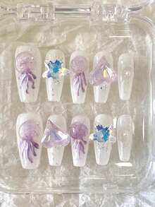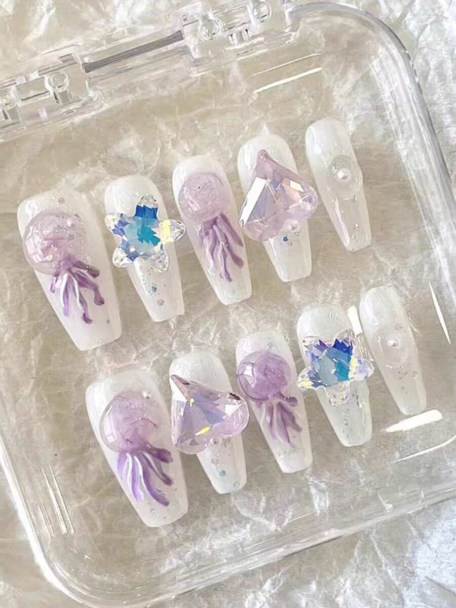(in Stock) 10pcs Purple Jellyfish Shaped Glue-on False Nails With Jelly Glue Included