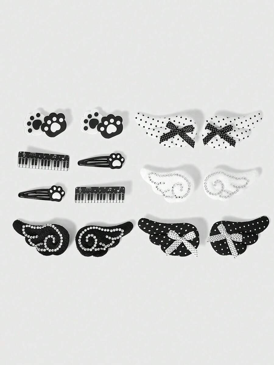 14 Pieces Random Cute Style Black And White Polka Dot Hairpins, Handmade Wing Bow Cat Claw Piano Hairclips, Lolita Style Rhinestone Hair Accessories
