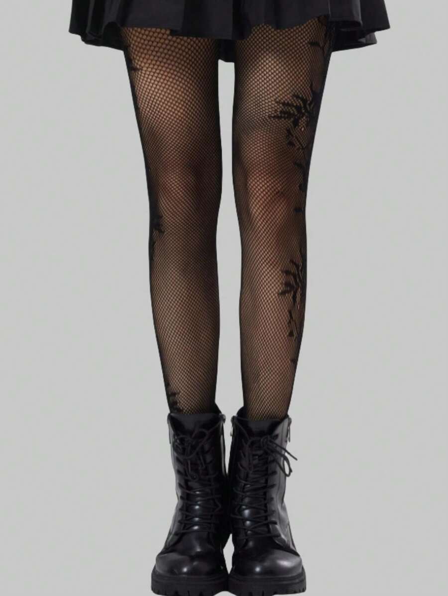 1pair Women's Black Gothic Jacquard Fishnet Stockings For All Seasons, Halloween