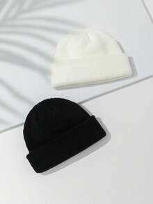 2pcs Unisex Black & White Knitted Hat Set, Casual Warm Winter Beanie