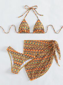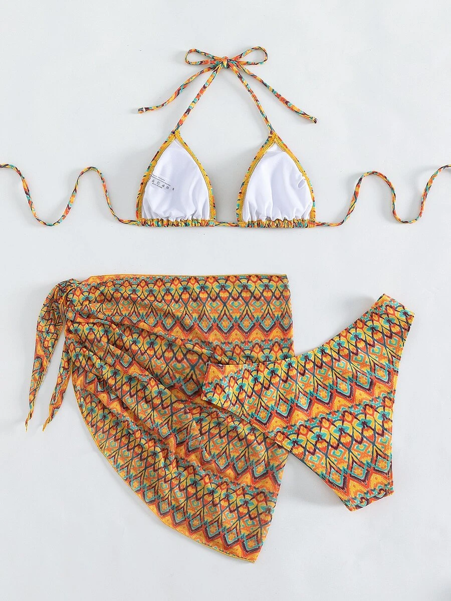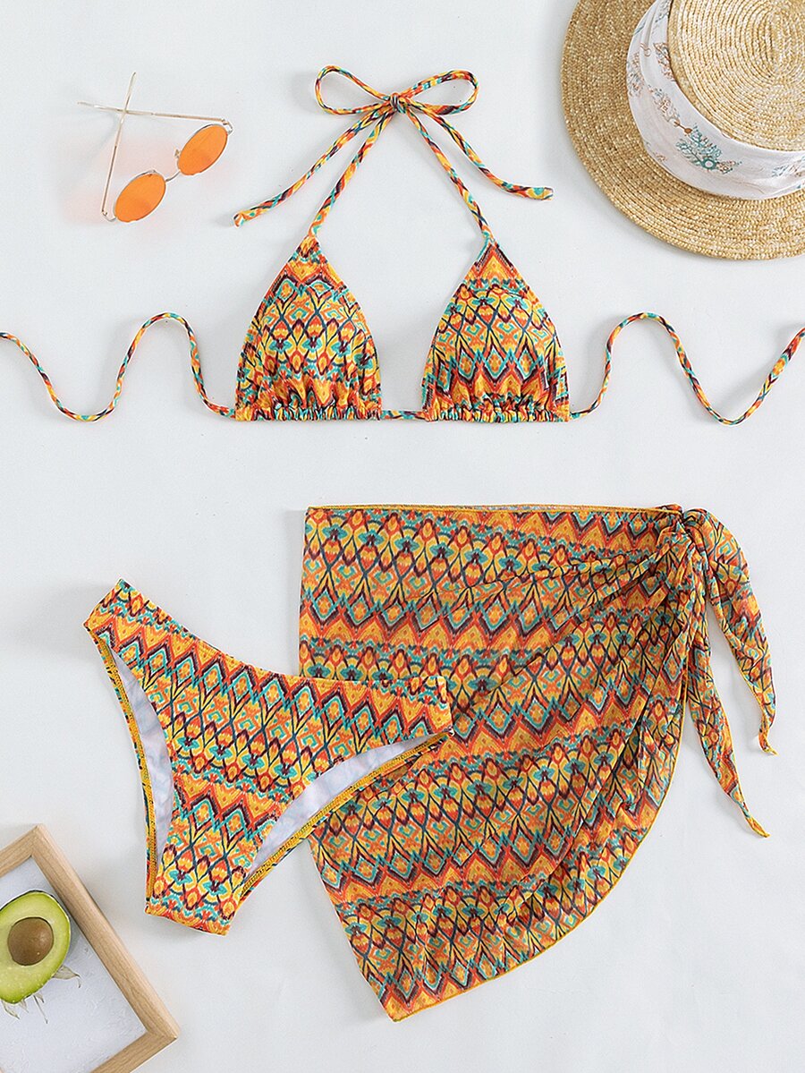 3packs Geo Print Triangle Summer Beach Bikini Set & Beach Skirt