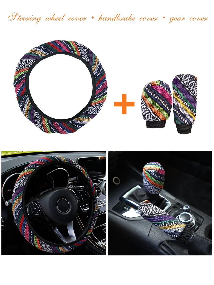 MEIKAXIU 3pcs/Set Breathable Linen Style Pattern Car Steering Wheel Cover, Handbrake Cover, Gear Shift Knob Cover Set