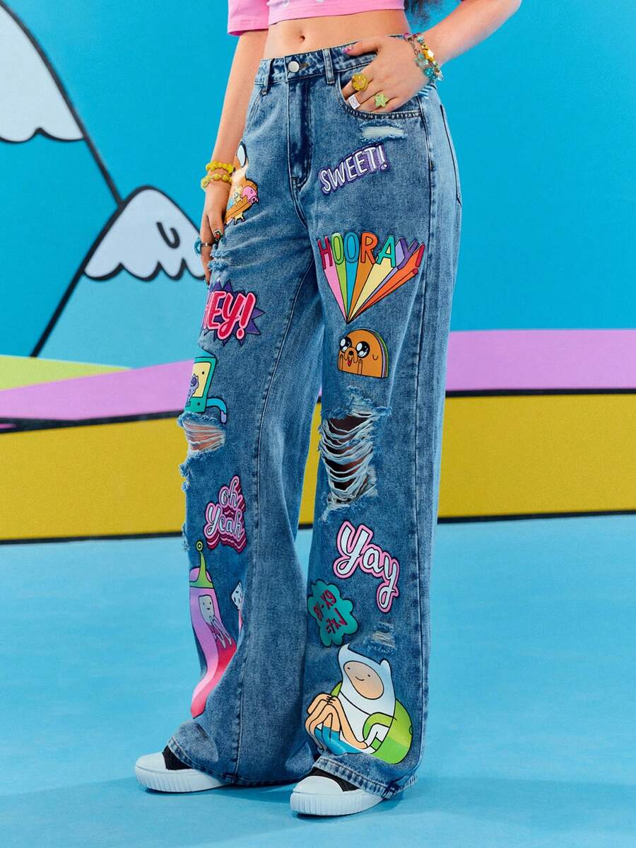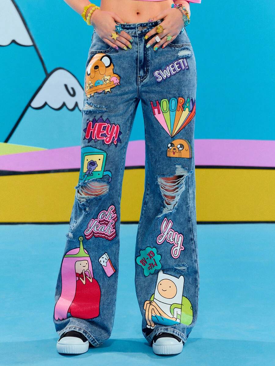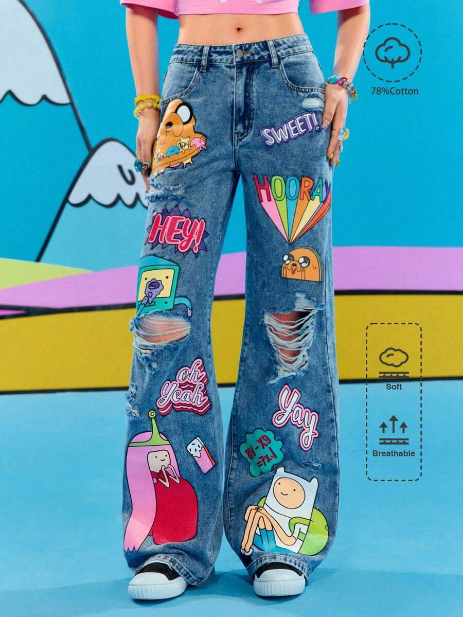 Adventure Time X ROMWE Graffiti Cartoon Pattern Loose Fit Jeans