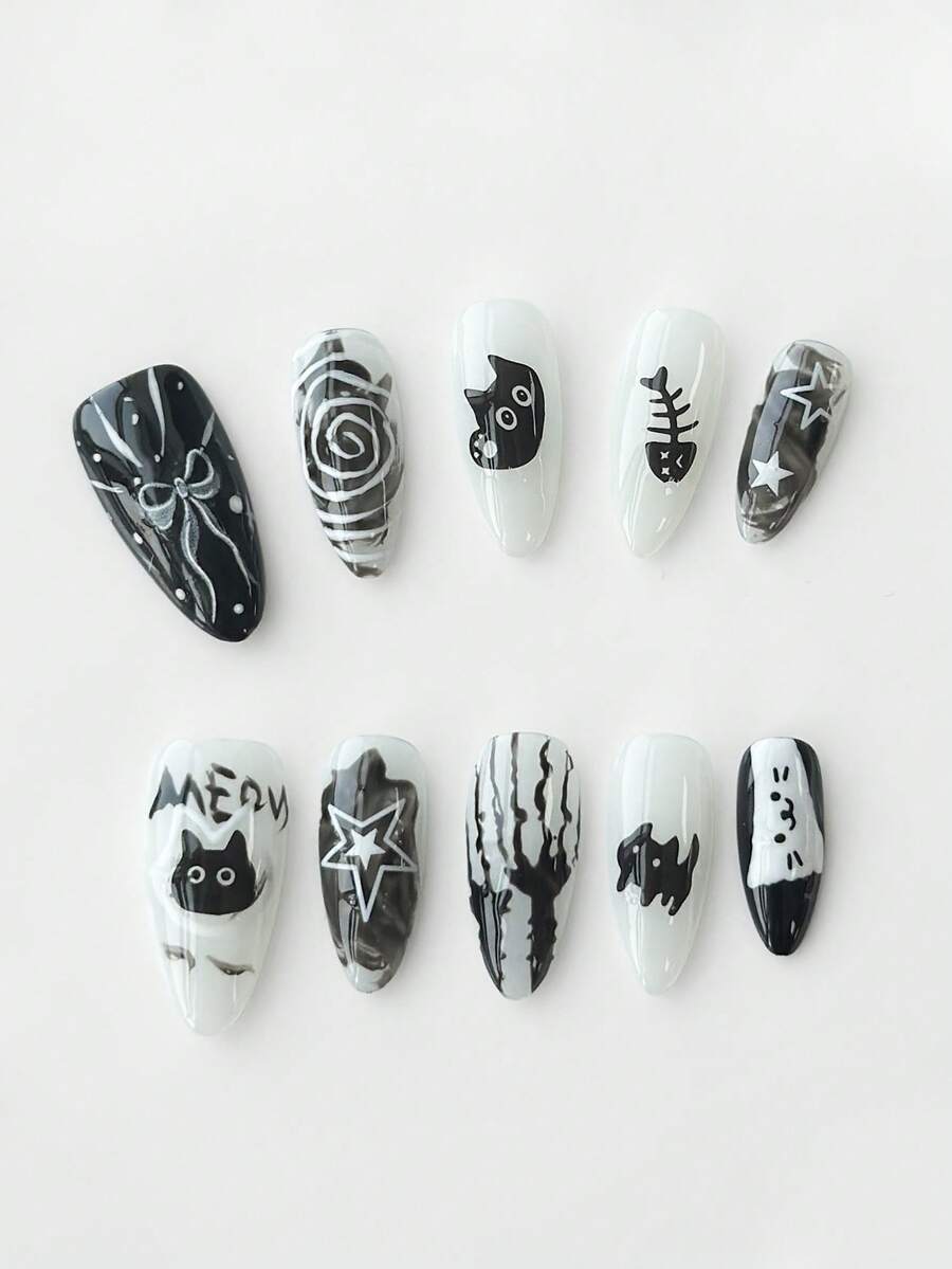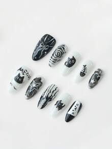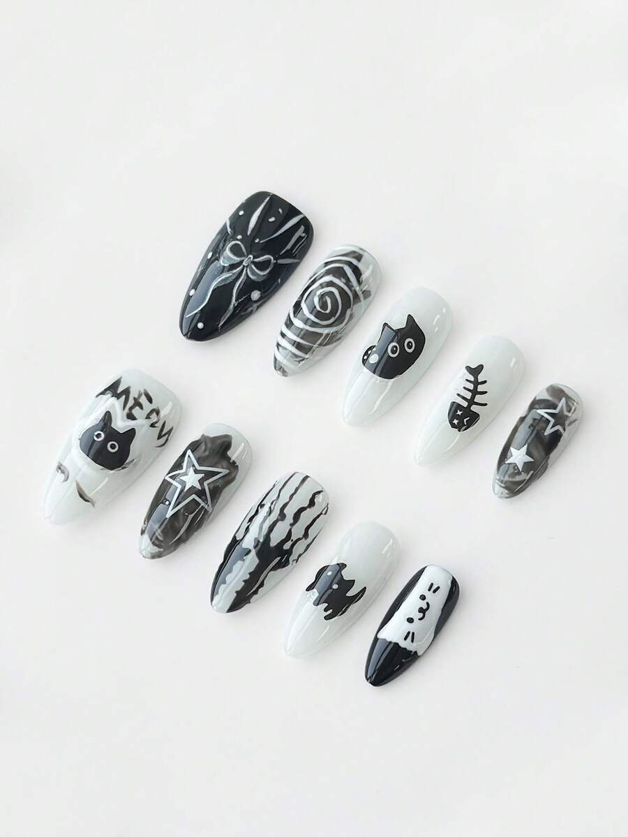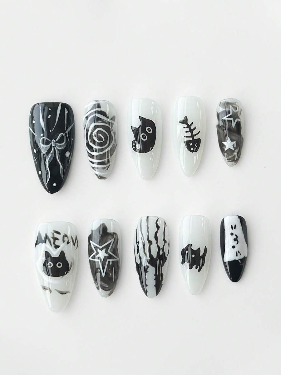 Anime 10pcs Cute Bowknot Music Note Star Element High Quality Handmade False Nails + 3pcs Double-Sided Adhesive, Y2K French Style Rhinestone Chain Polka Dot Removable Nail Art Stickers, Suitable For Holidays, Parties, Dancing And Daily Wear