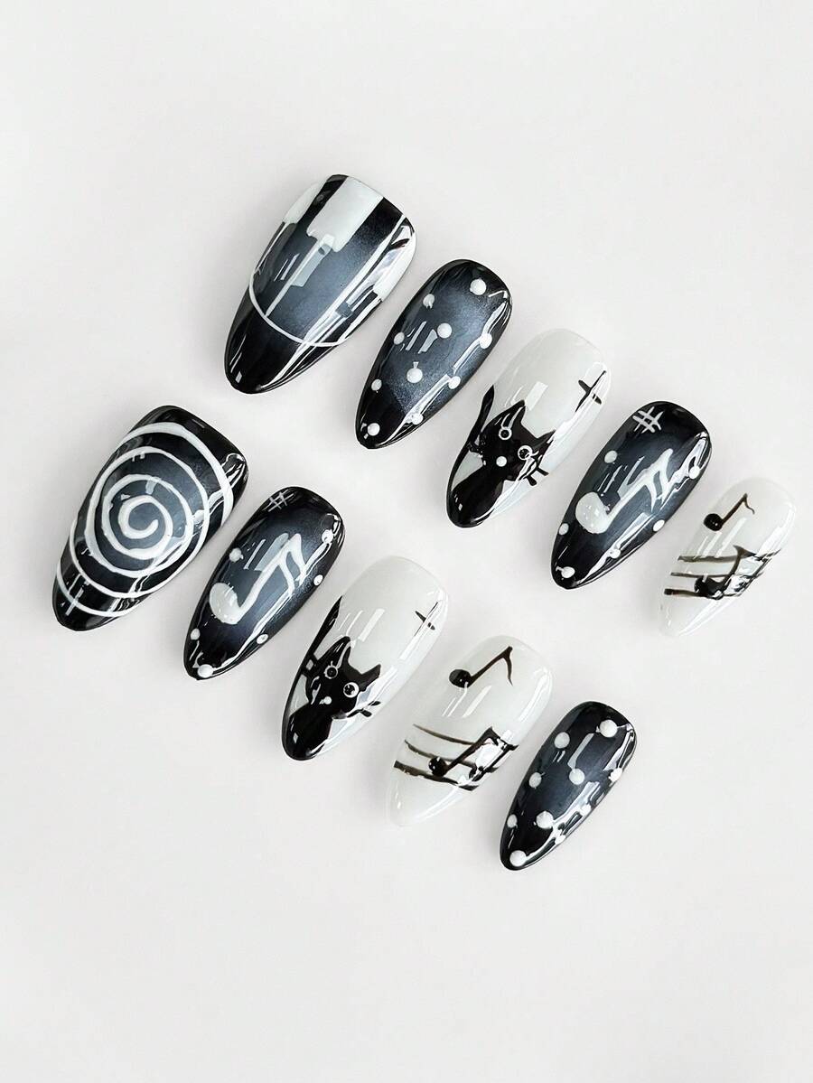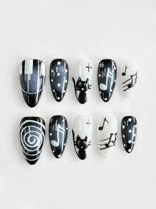 Anime 10pcs Dark Style Musical Note & Polka Dot Piano Key Pattern High Quality Handmade False Nails + 3pcs Double-Sided Adhesive, Y2K Style Blue & Black Ombre Nail Stickers, Removable Hand-Painted Black Cat Nail Art Stickers, Suitable For Holidays, Parties, Dancing And Daily Wear