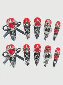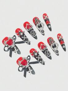 Anime 10pcs Y2K Style Heart, Bow, Cross, Skull, Star, Hoop, Claw Fake Nails With 1pc Nail Tape
