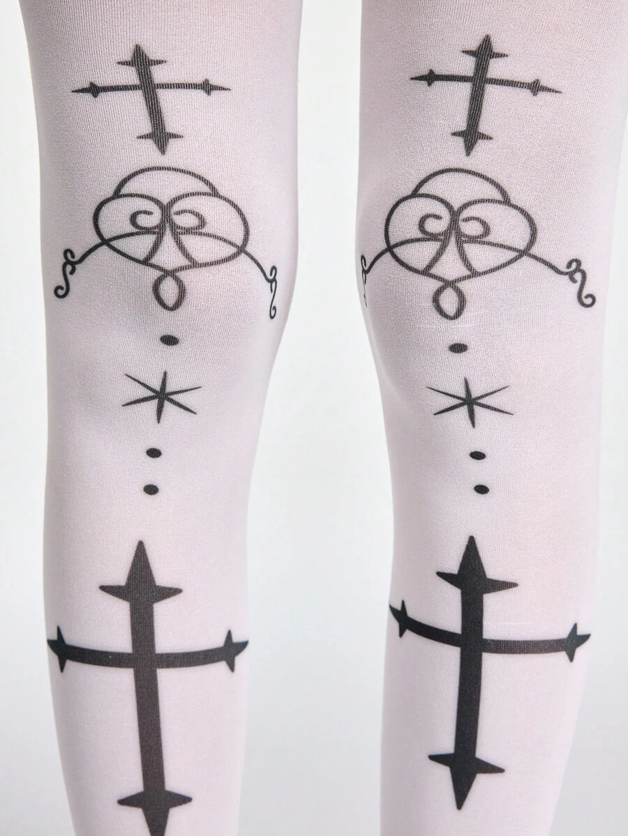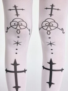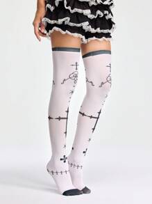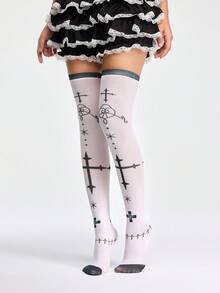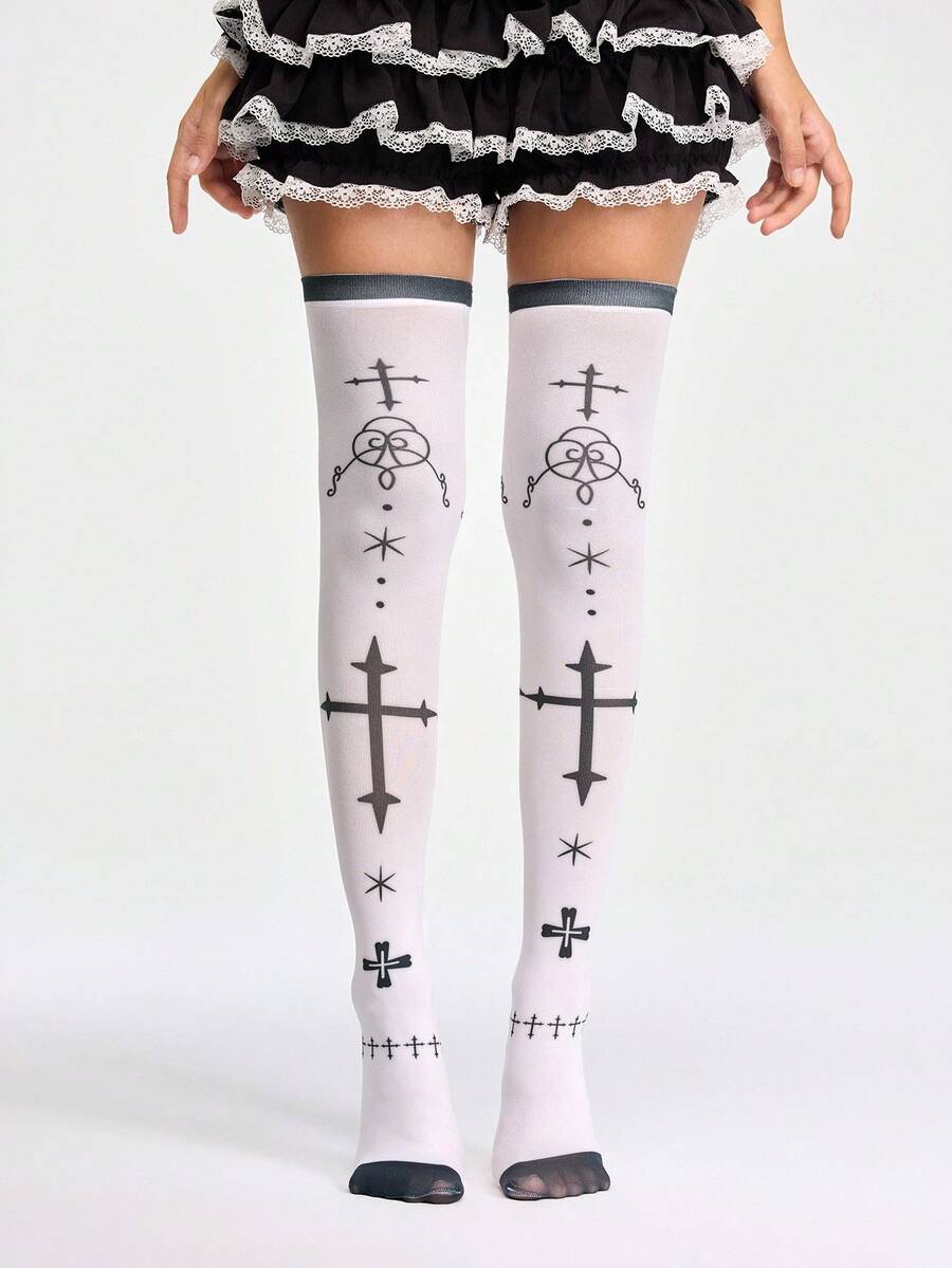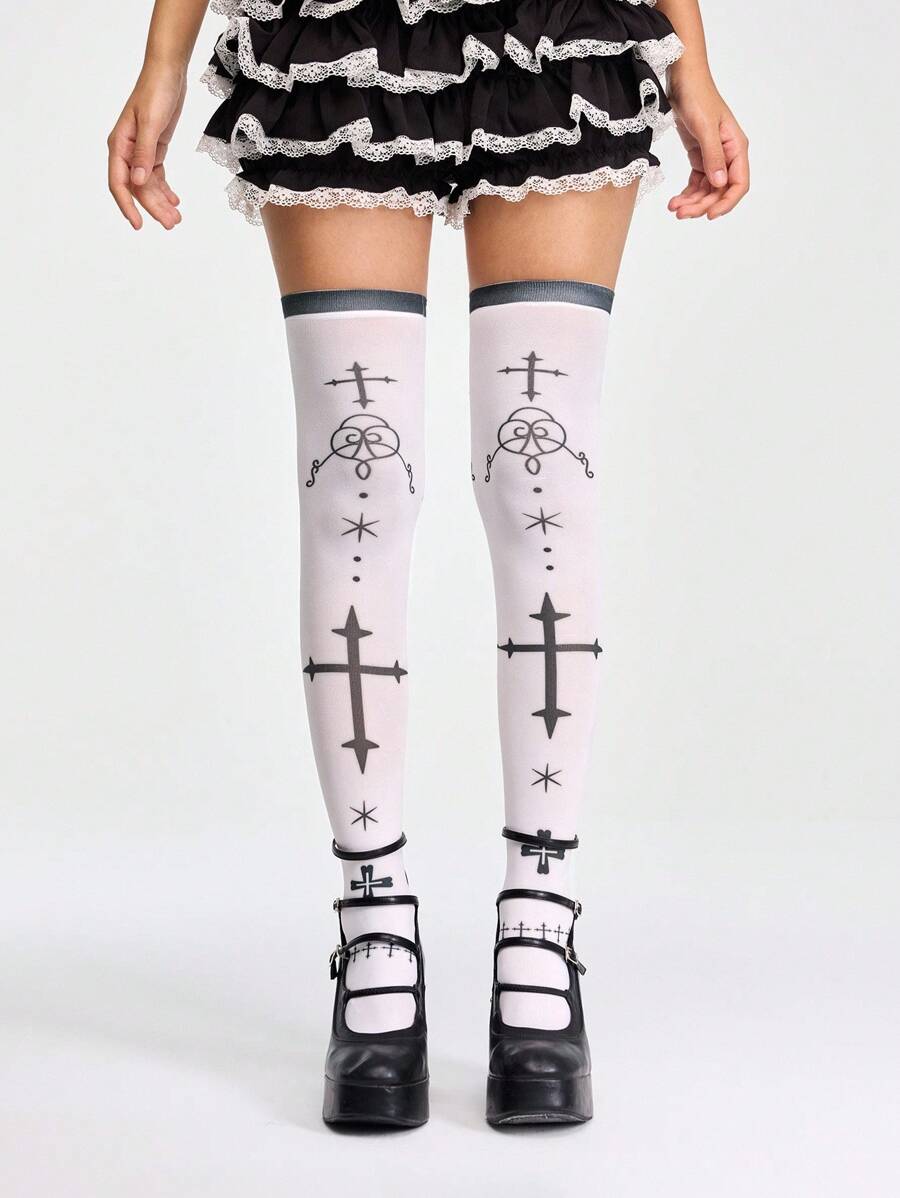 Anime Gothic Cross Print White Thigh High Socks, Dark Lolita Sweet & Cool Personal Style Fashion Socks, Halloween