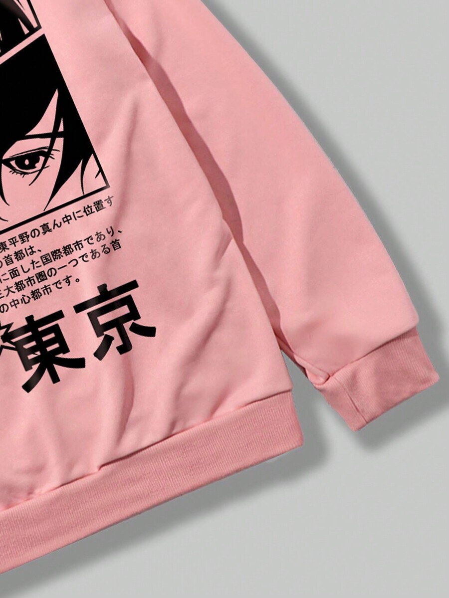 Anime Guys Japanese Letter & Figure Graphic Drawstring Thermal Lined Hoodie