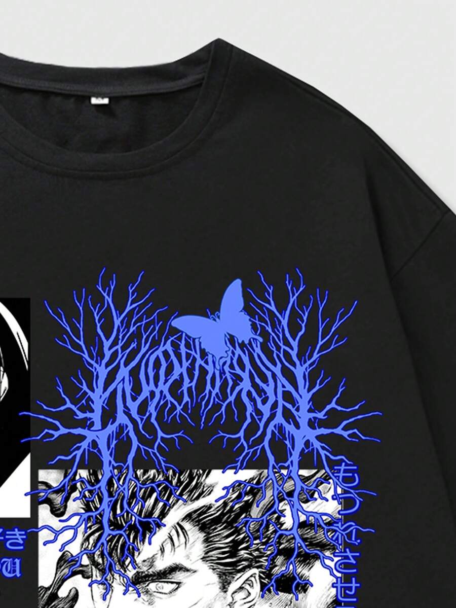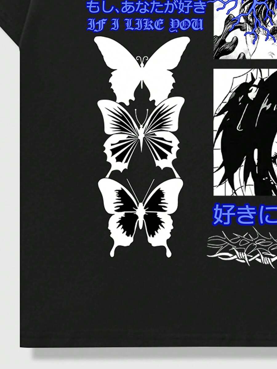 Anime Men's Butterfly & Letter Print Short Sleeve T-shirt