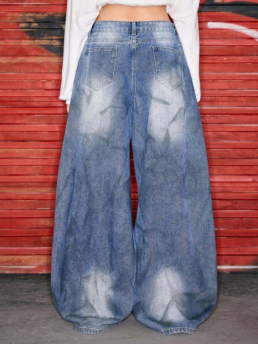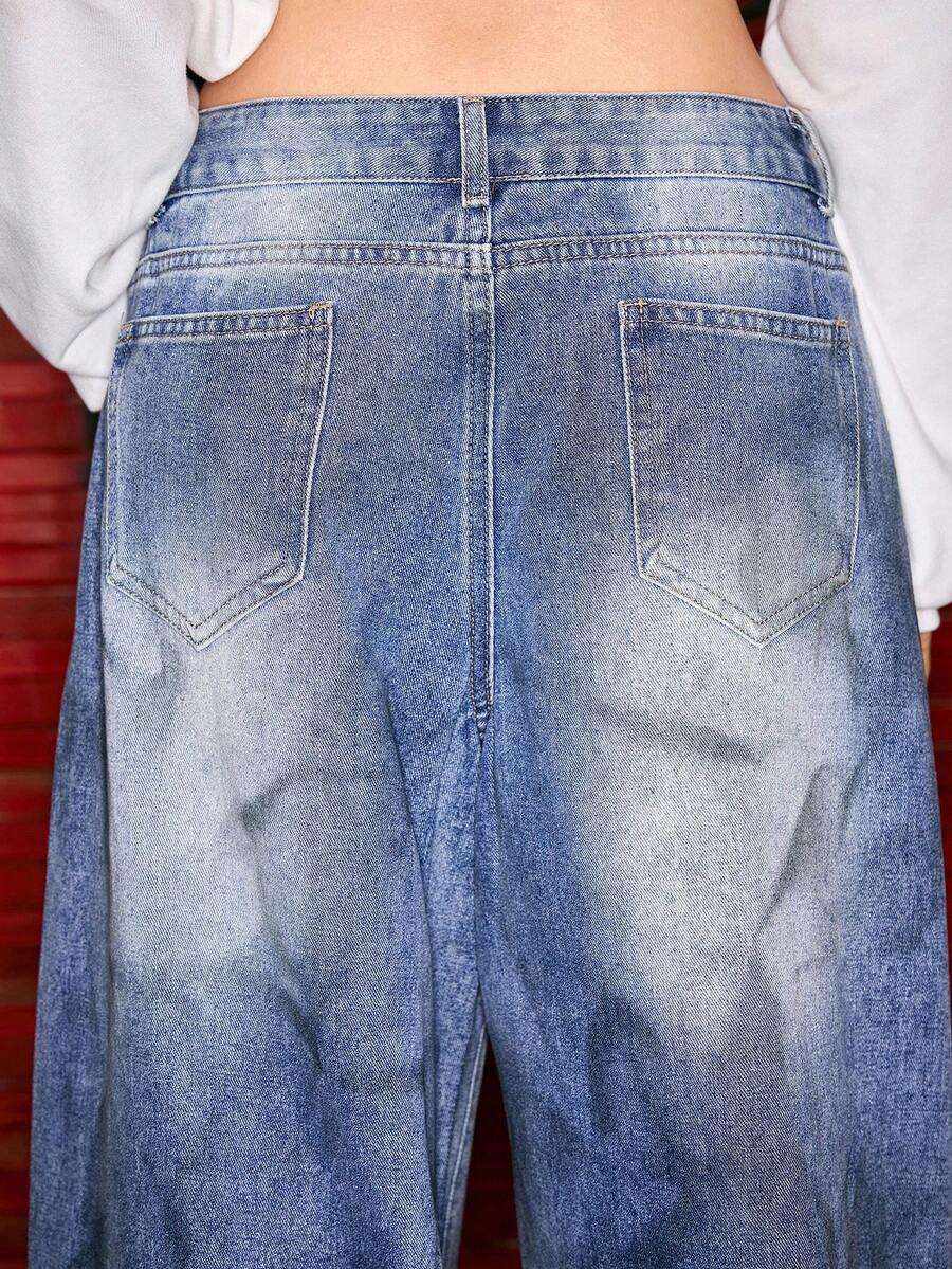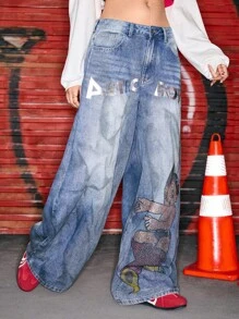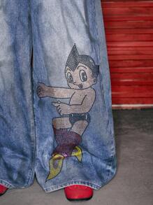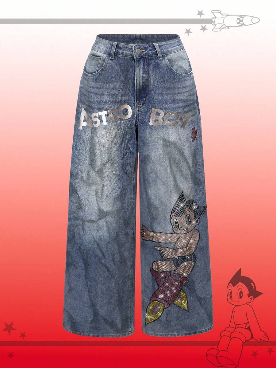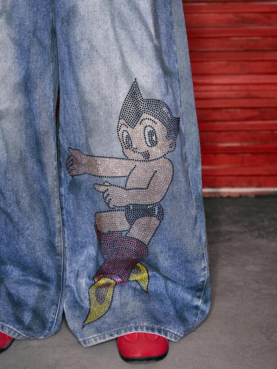 Astro Boy X ROMWE Rhinestone Embellished Extra Loose Low Waist Baggy Women`S Jeans