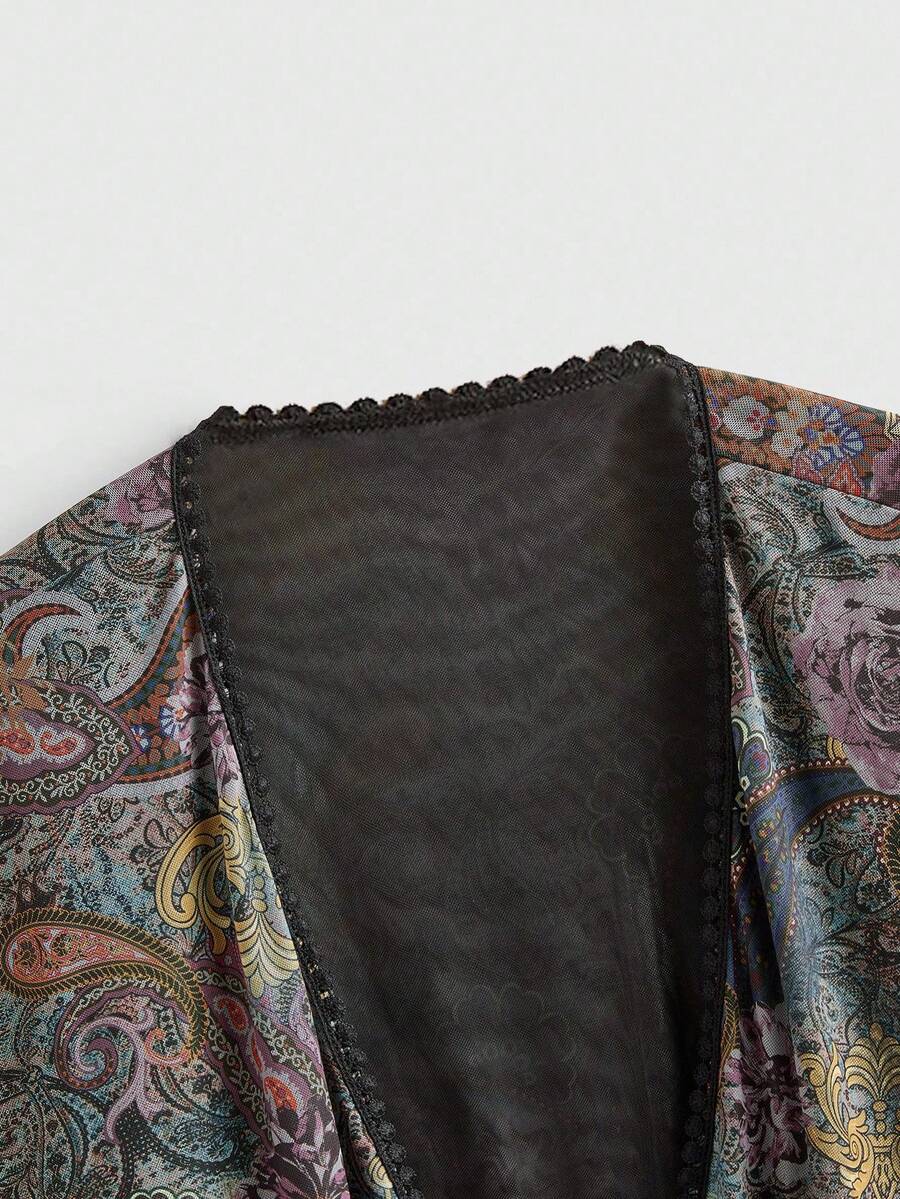 Back To School Women's Retro Hippie Western Cowgirl Style Beaded Fringe Asymmetrical Hem Paisley Print Cardigan, Seamless Shoulders Kimono Cardigan
