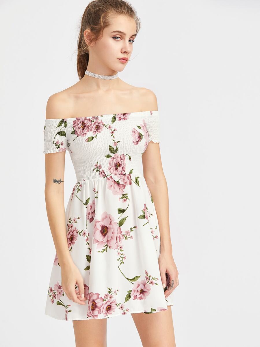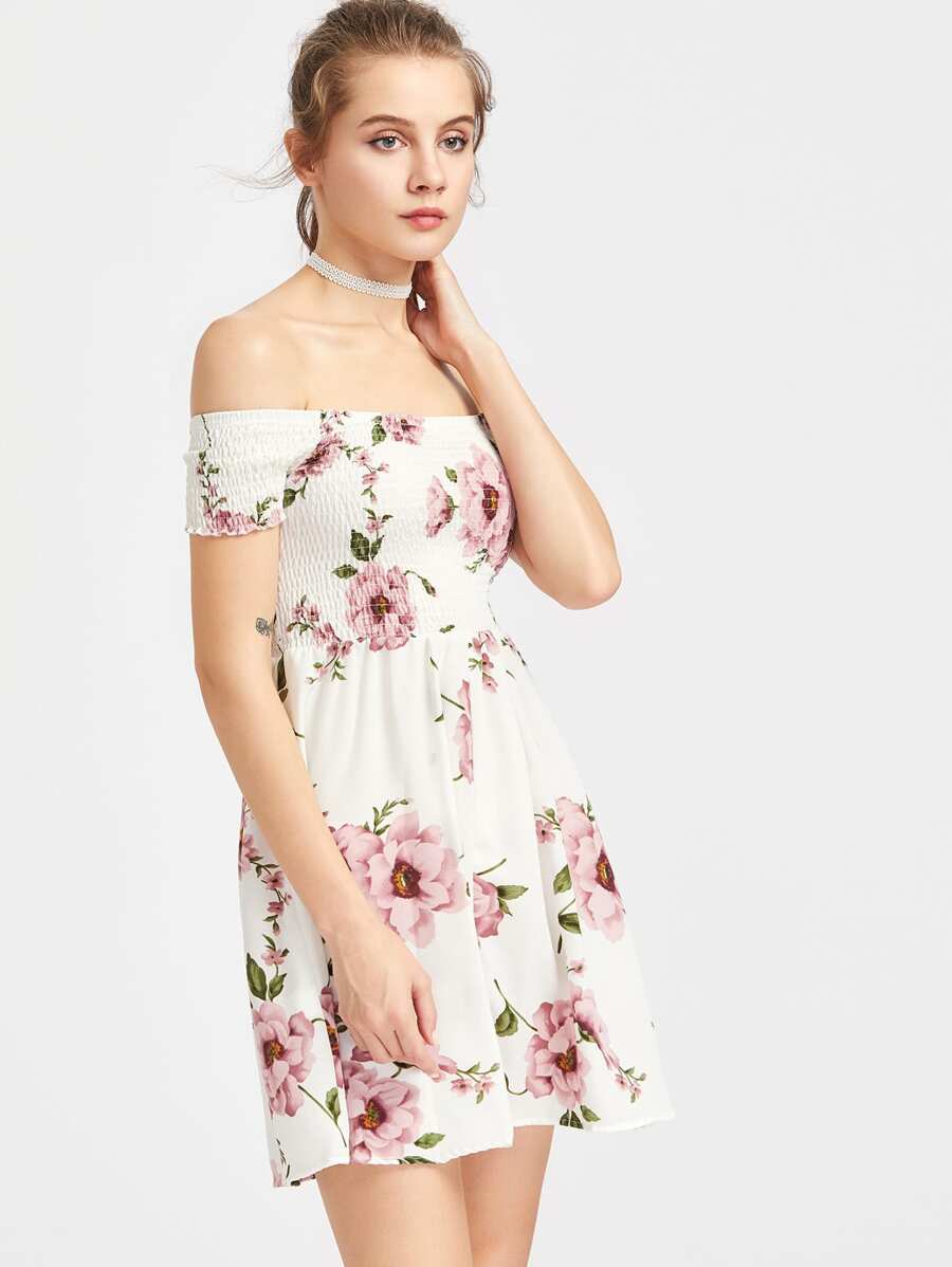 Floral Print Smocked Bardot Dress