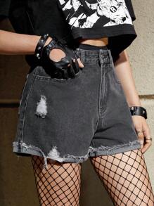 Batman X ROMWE Embroidery Bat Pattern Raw Hem Denim Shorts