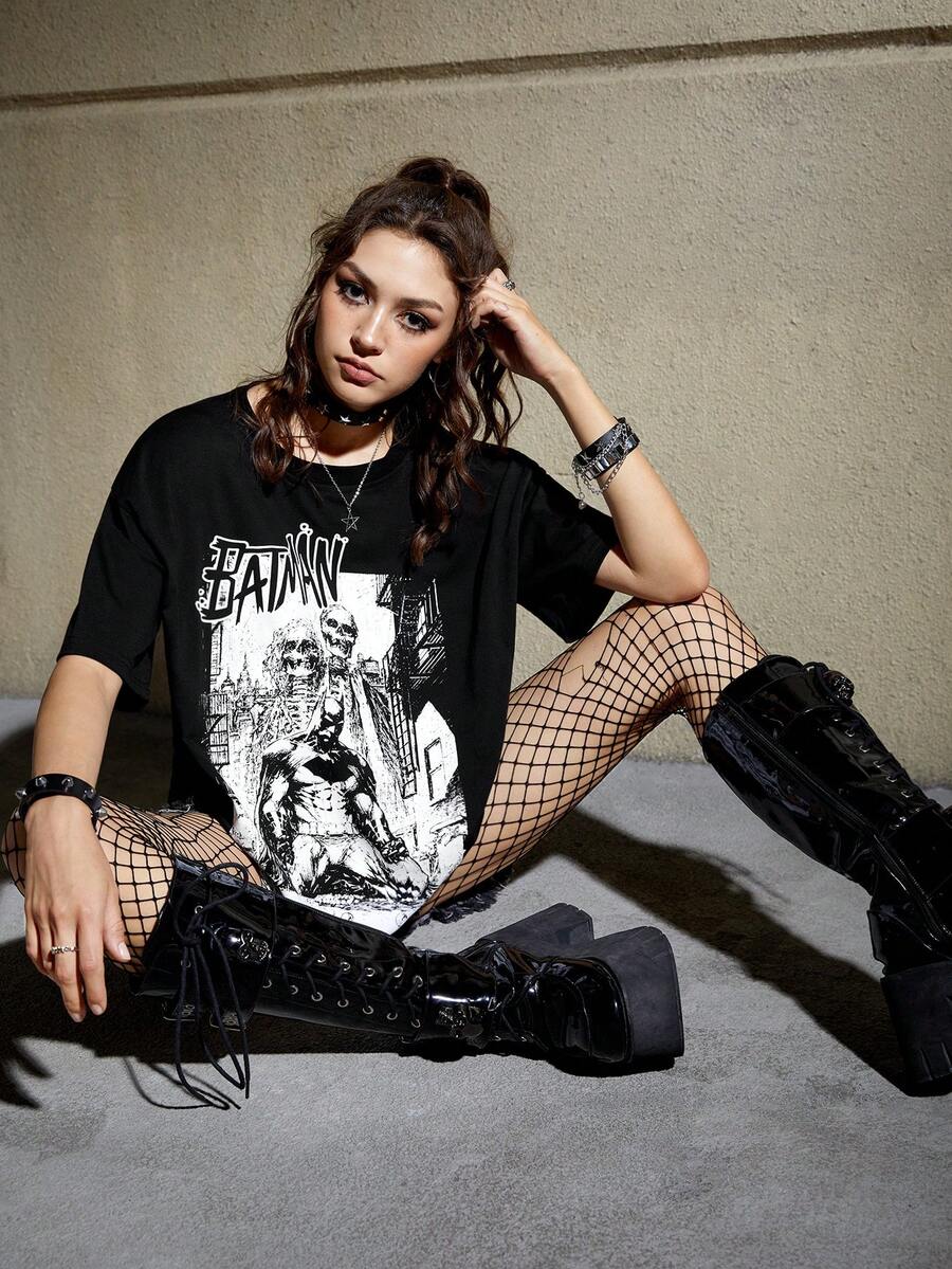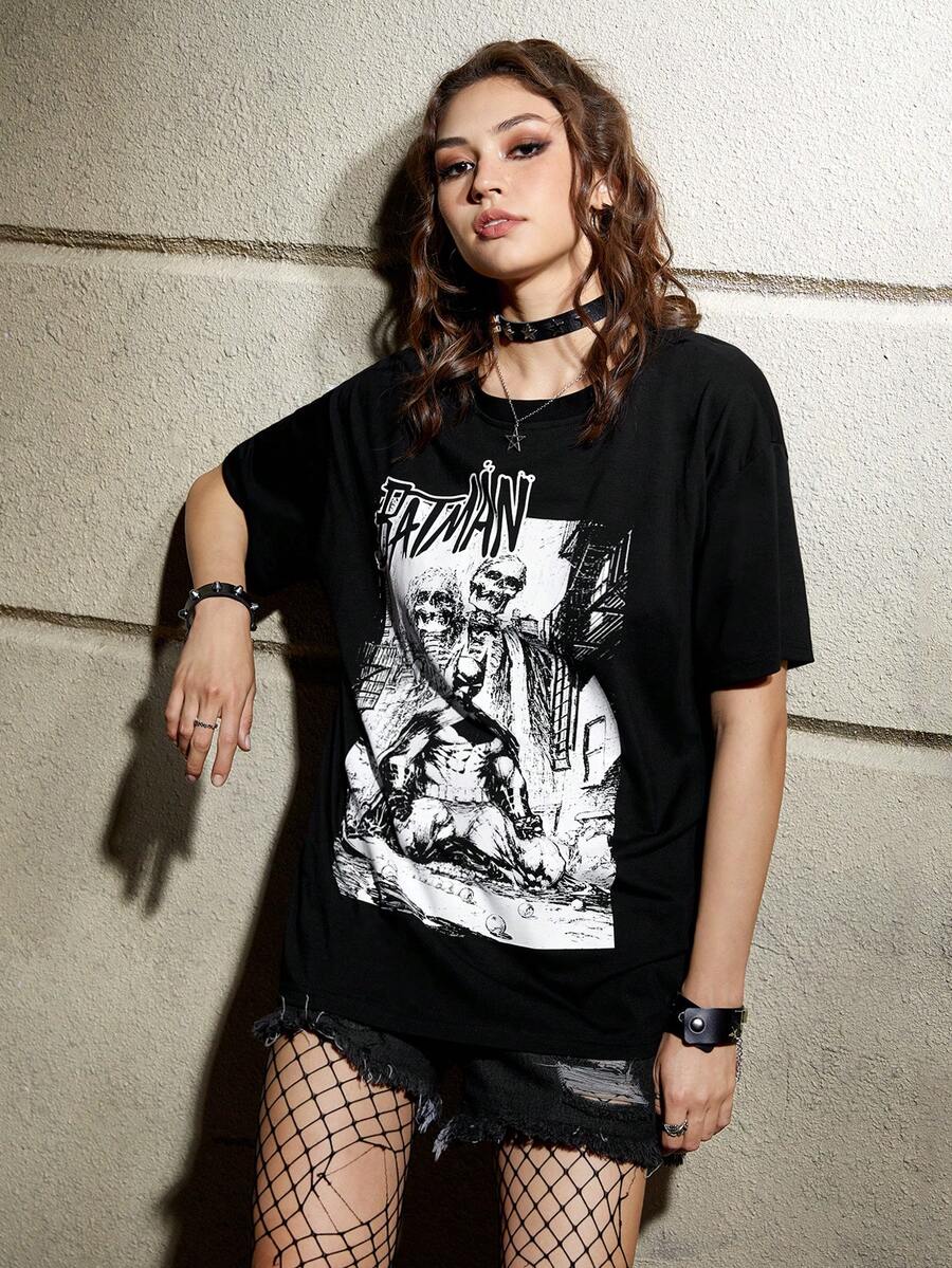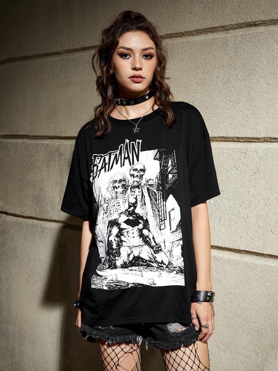 Batman X ROMWE Letter & Skull Graphic Tee, School