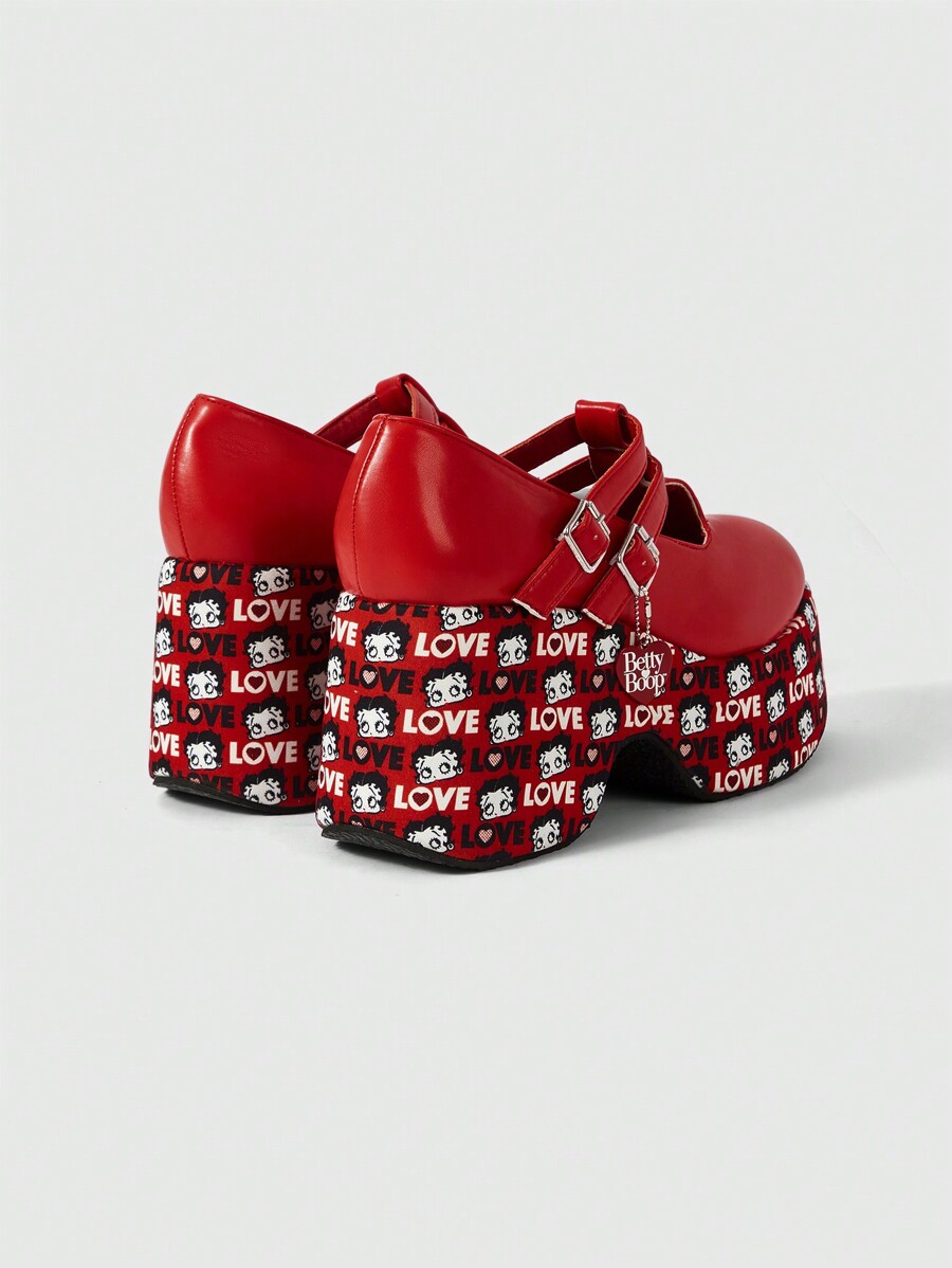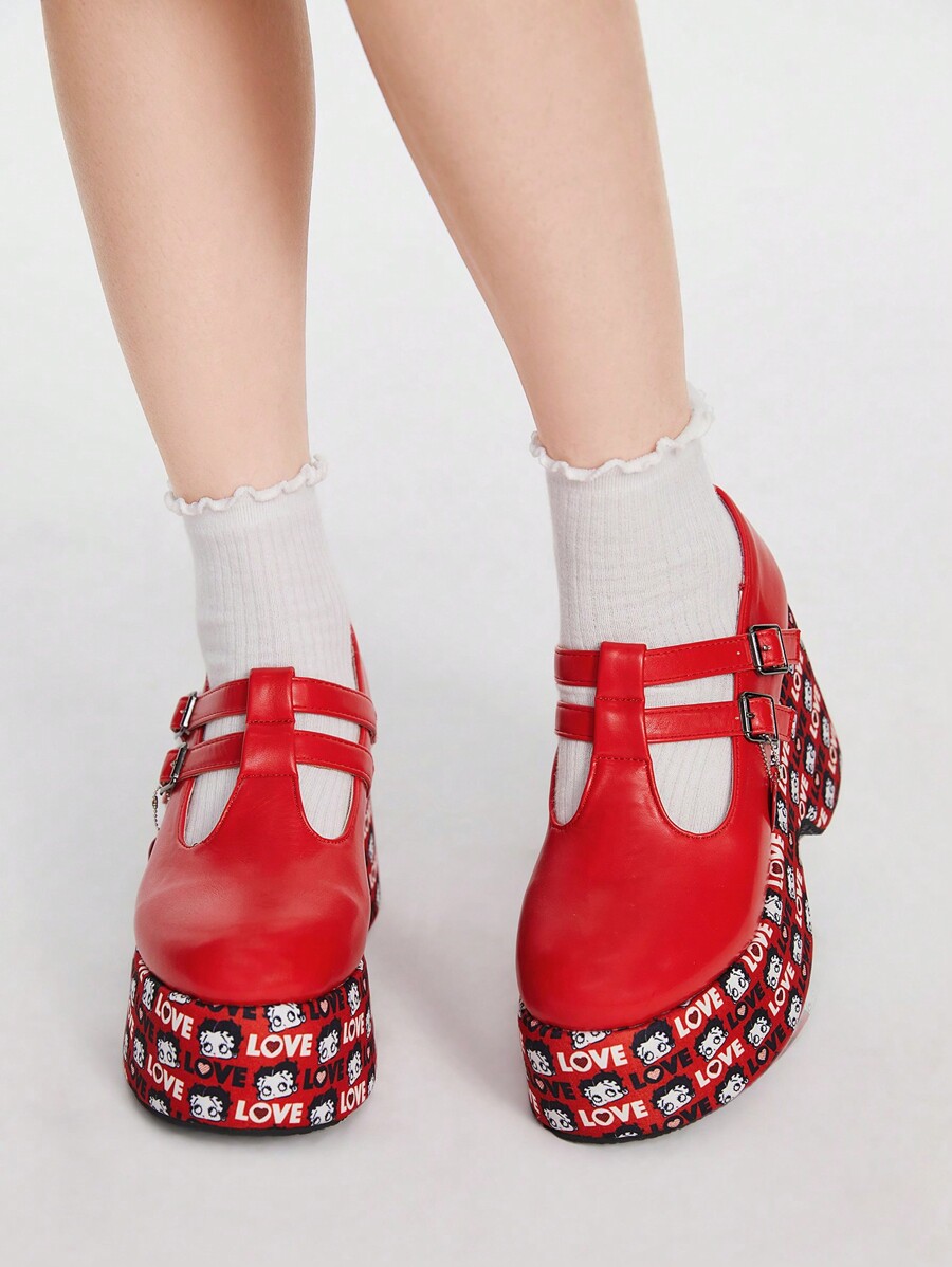 Betty Boop | ROMWE Women Cartoon Letter Print Buckle Detail Wedge Heels Platform Shoes Fall