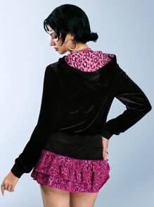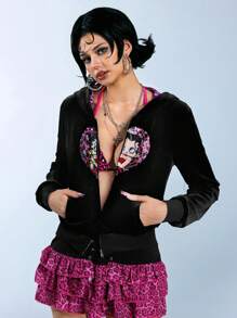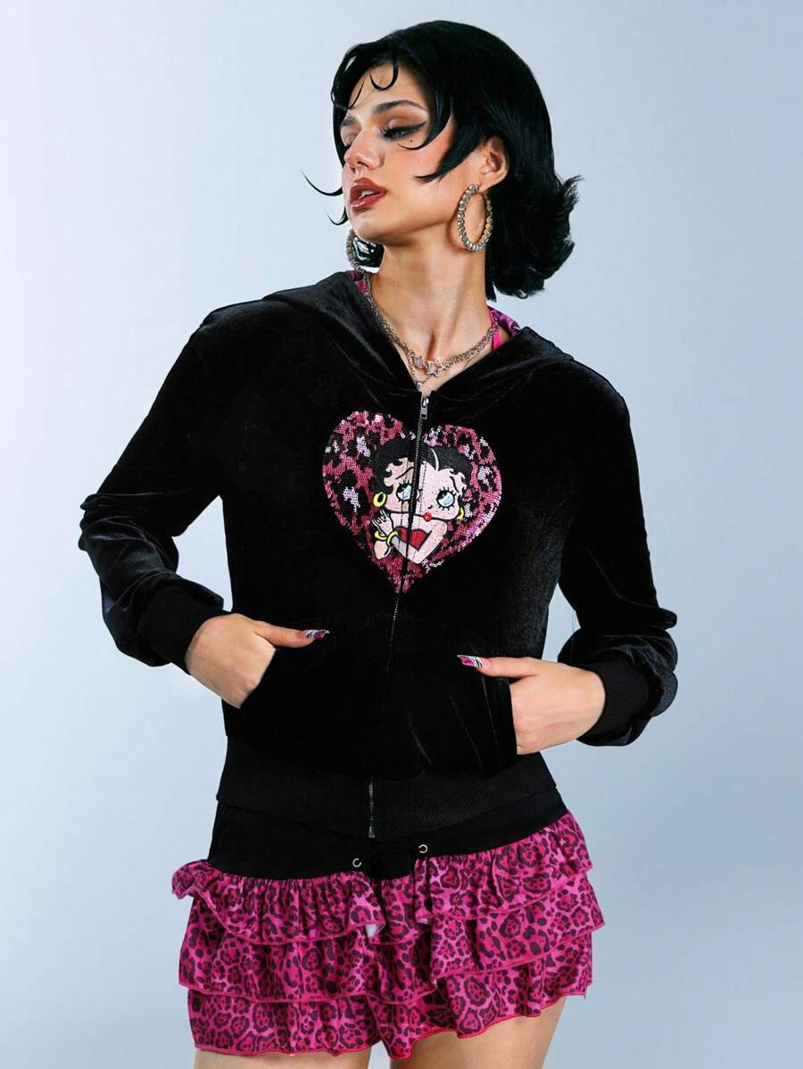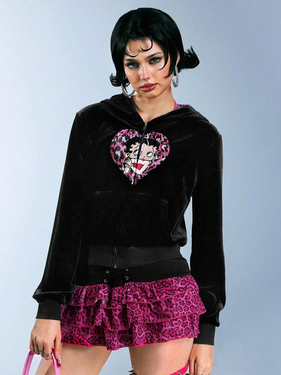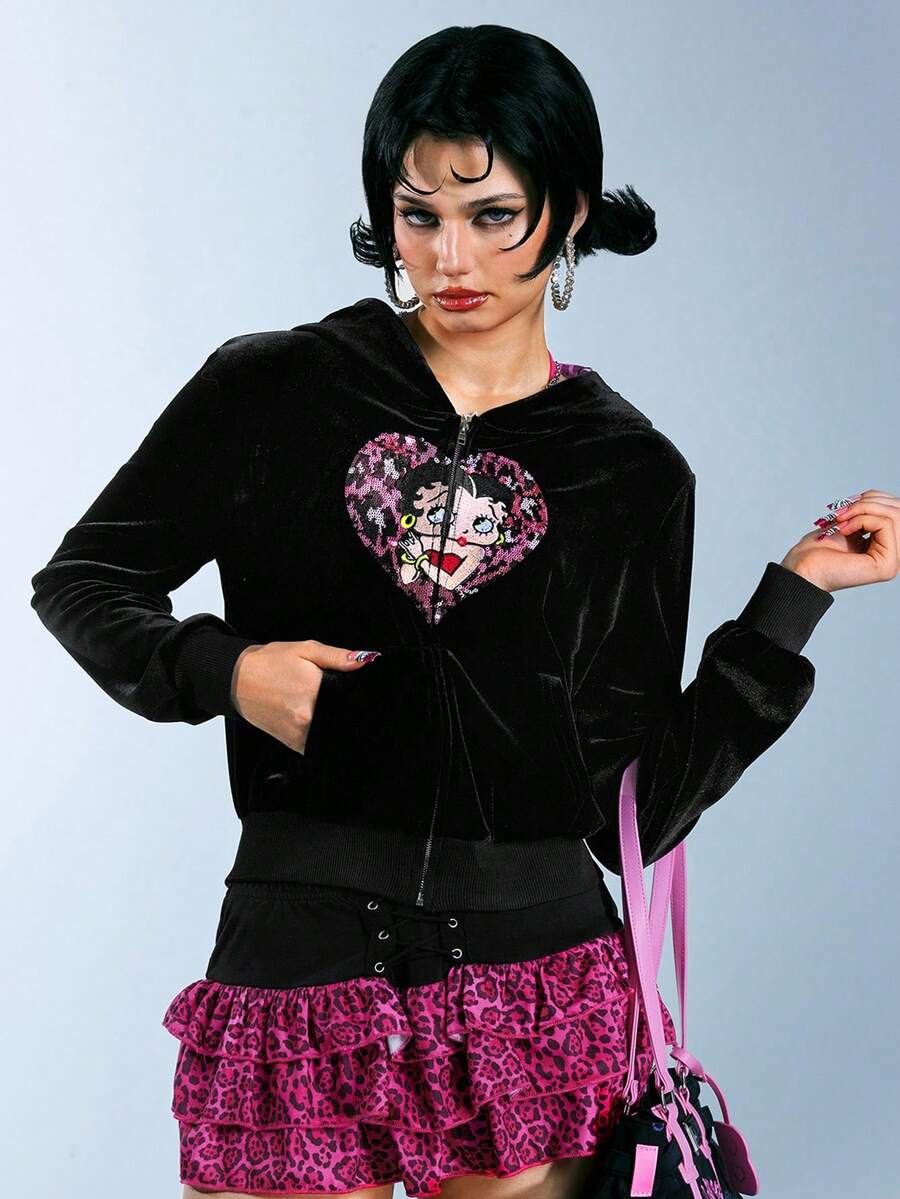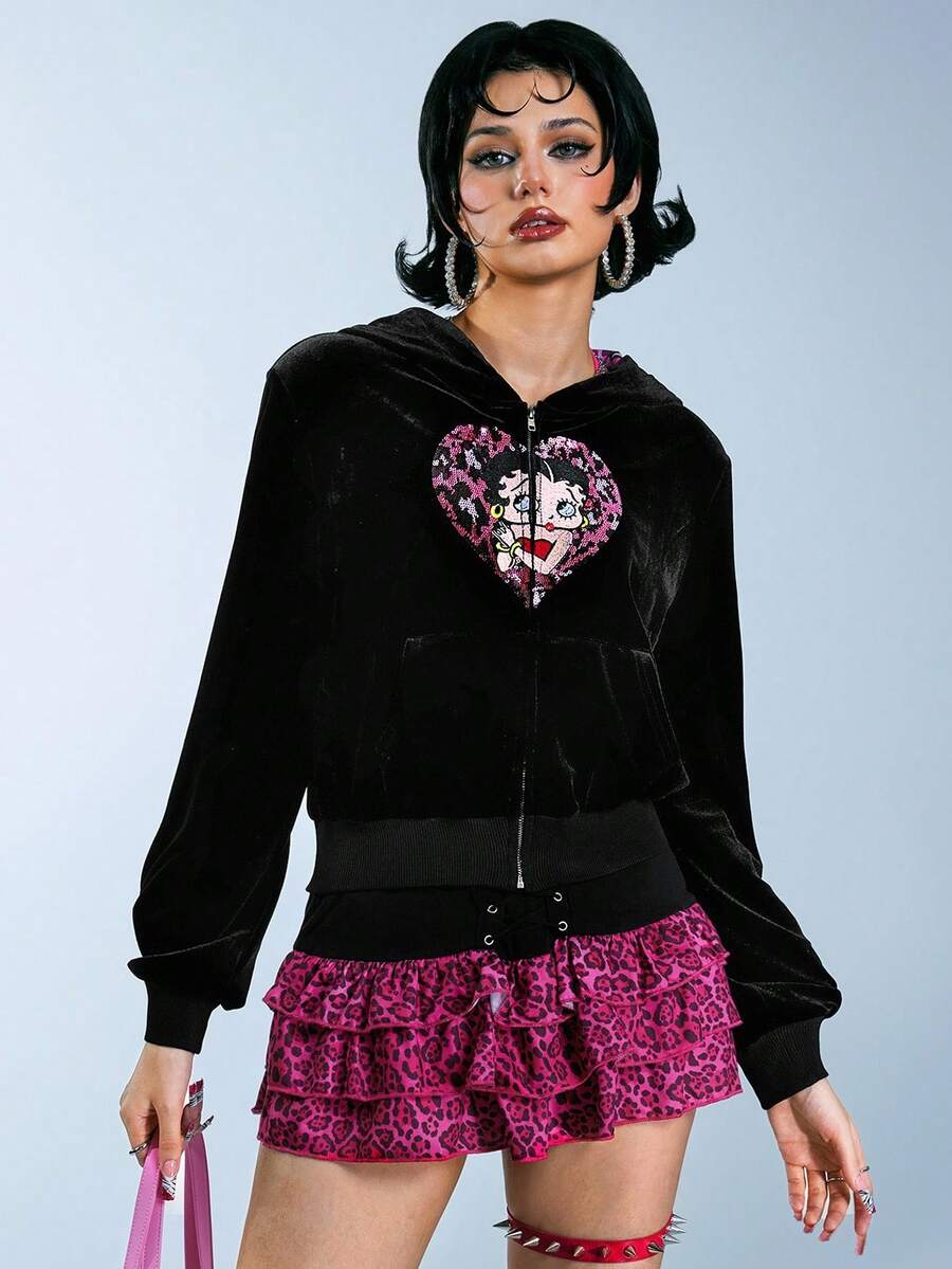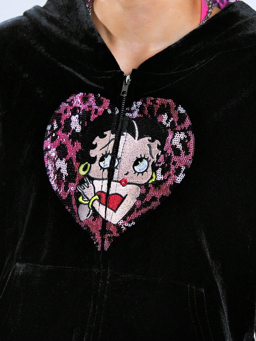 Betty Boop | ROMWE Y2K Style Sweet & Spicy Betty Heart Embroidery Sequin Pink Leopard Heart Velvet Sweatshirt For Women