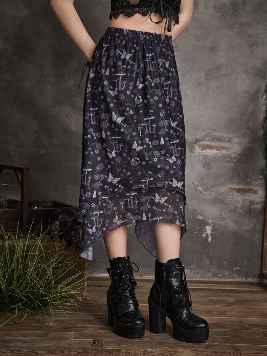 Butterfly & Floral Allover Print Asymmetrical Hem Skirt