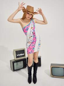 Butterfly Print One Shoulder Bodycon Dress