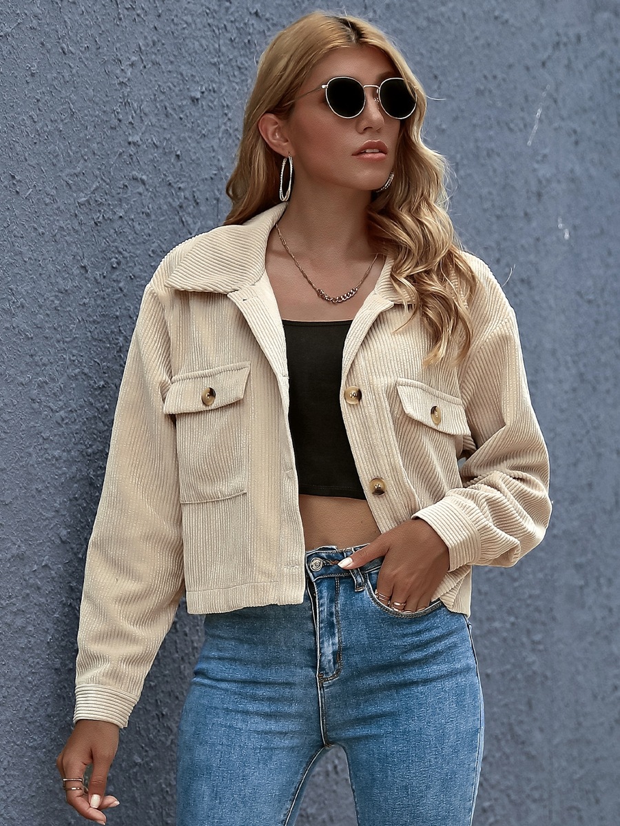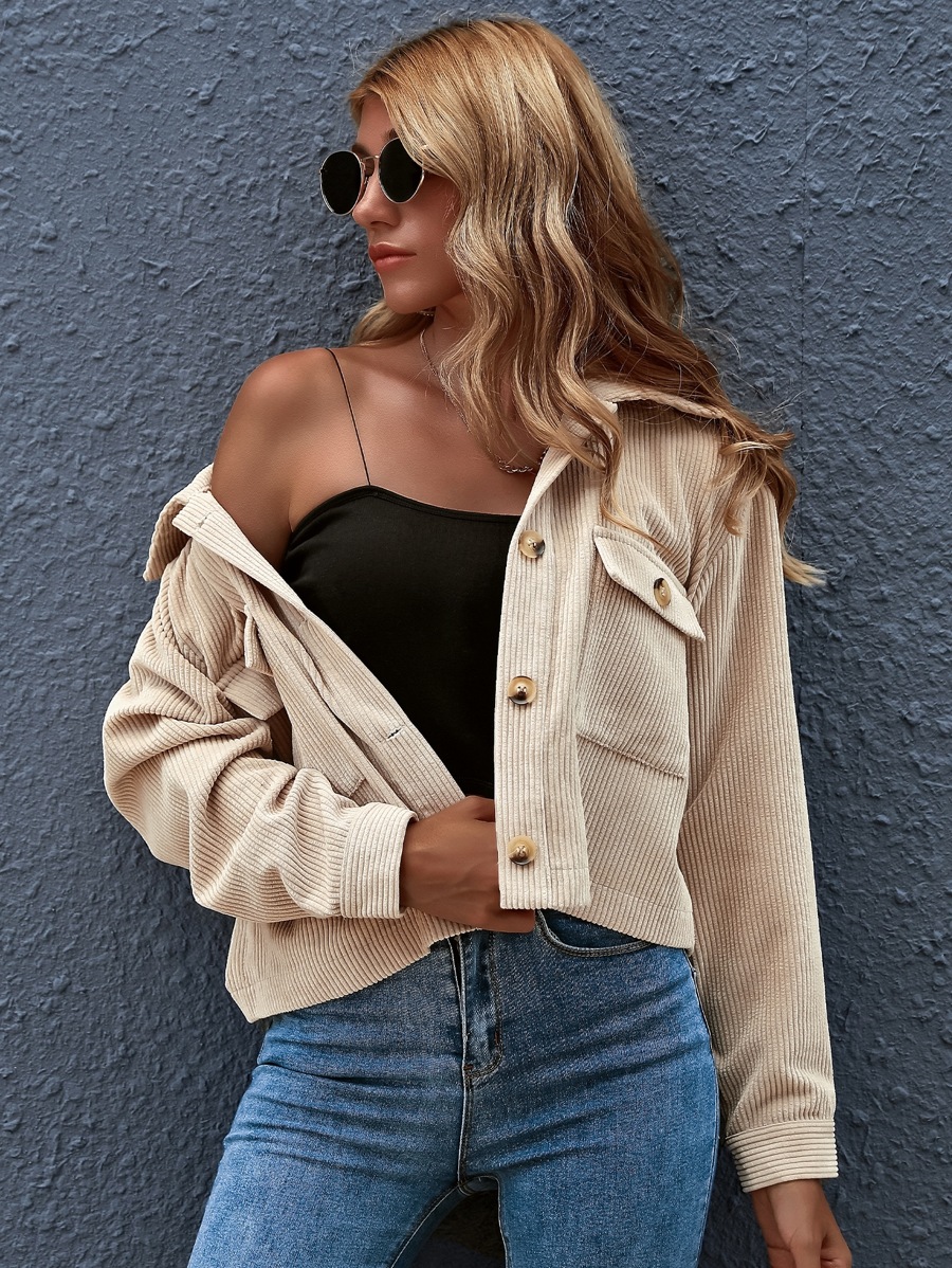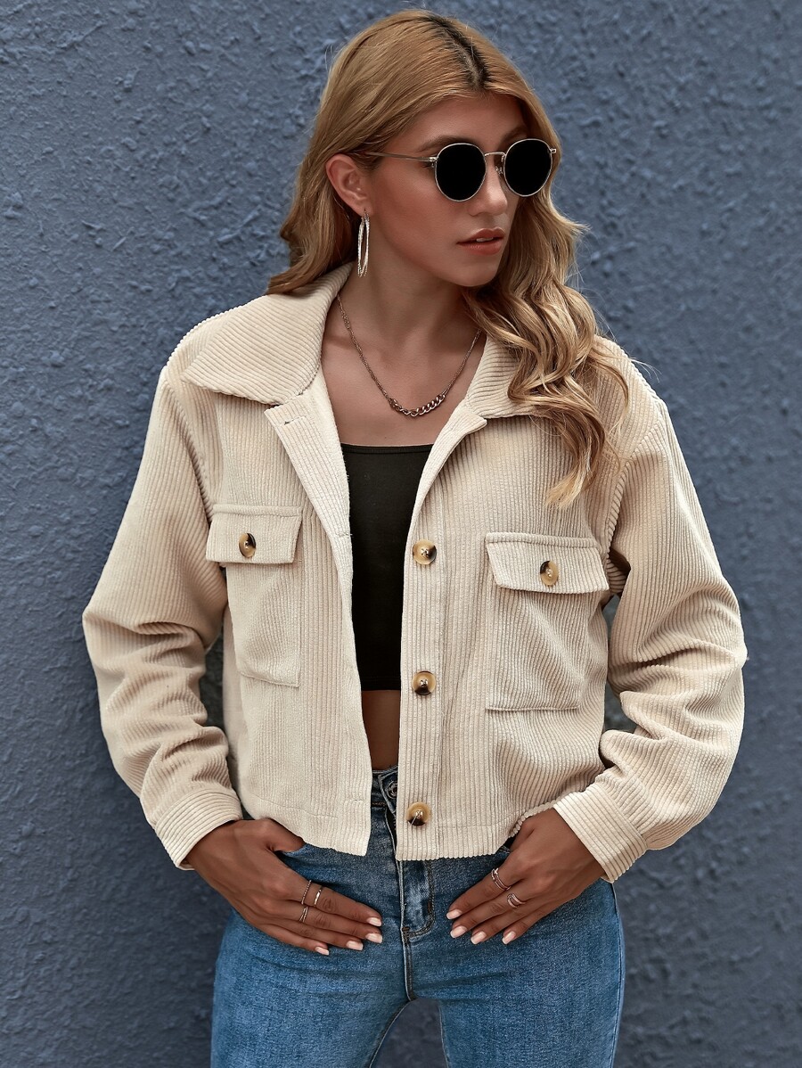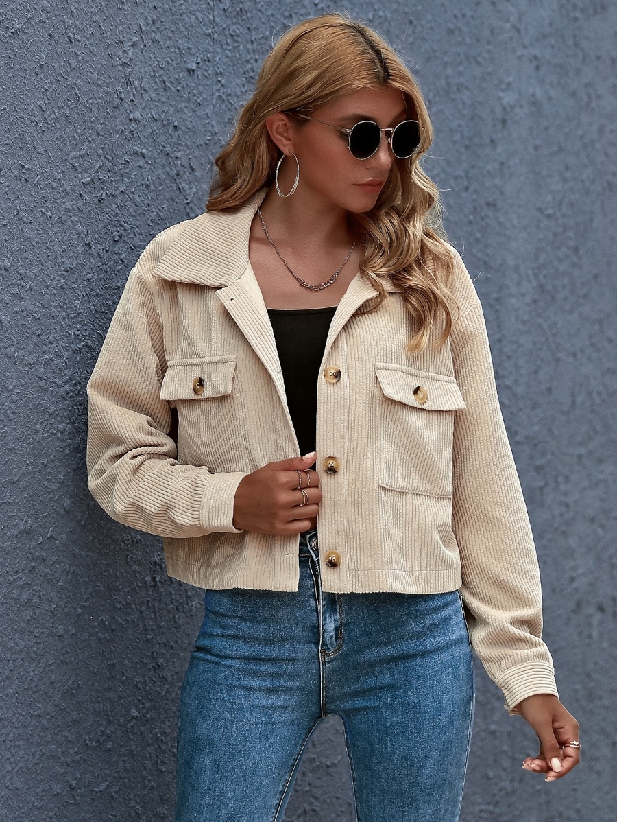 Button Front Patch Pocket Crop Jacket,Ladies Spring/Fall Casual Button,Pocket Drop Shoulder Collar Regular Fit Apricot Plain Women Jackets,Casual Daily Wear