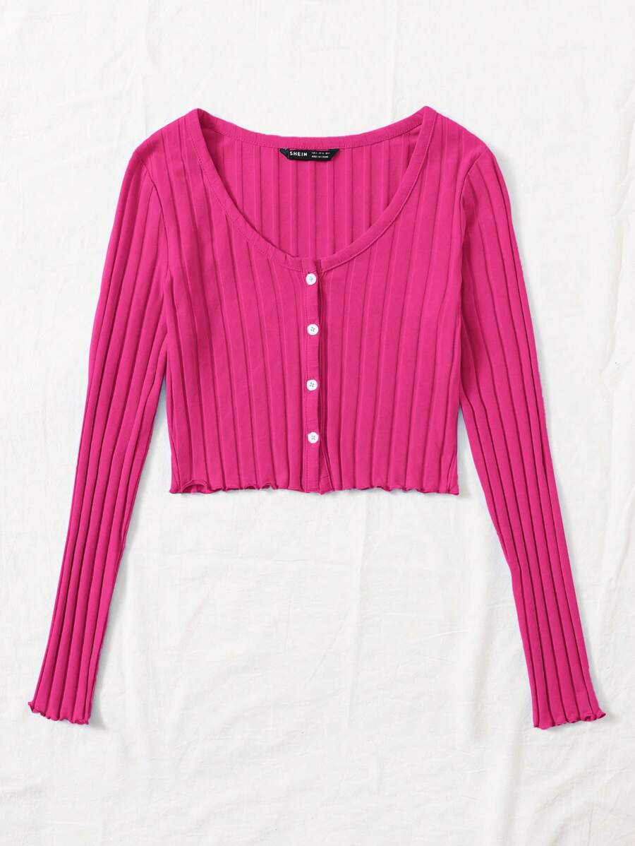 Buttoned Front Lettuce Trim Rib-knit Top