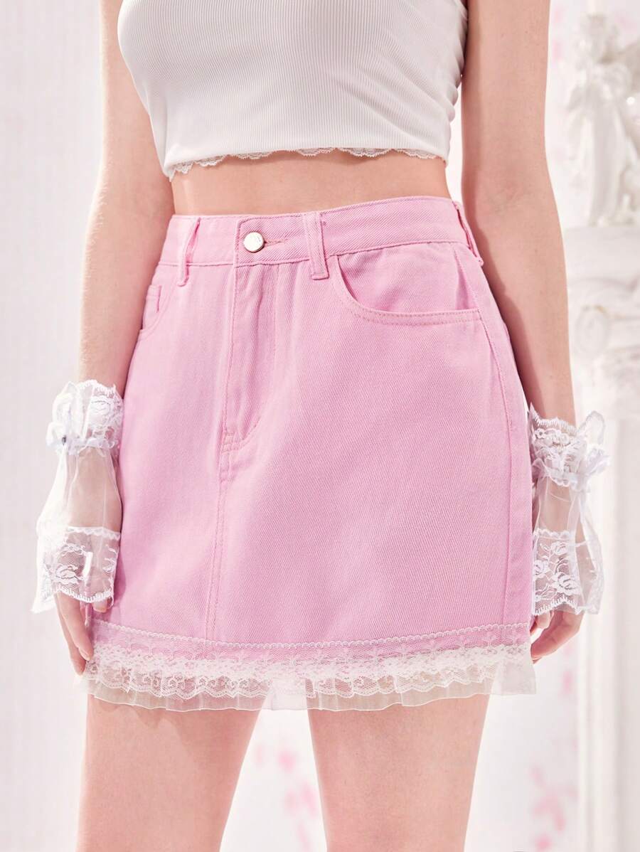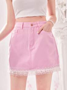 Contrast Lace Hem Denim Skirt