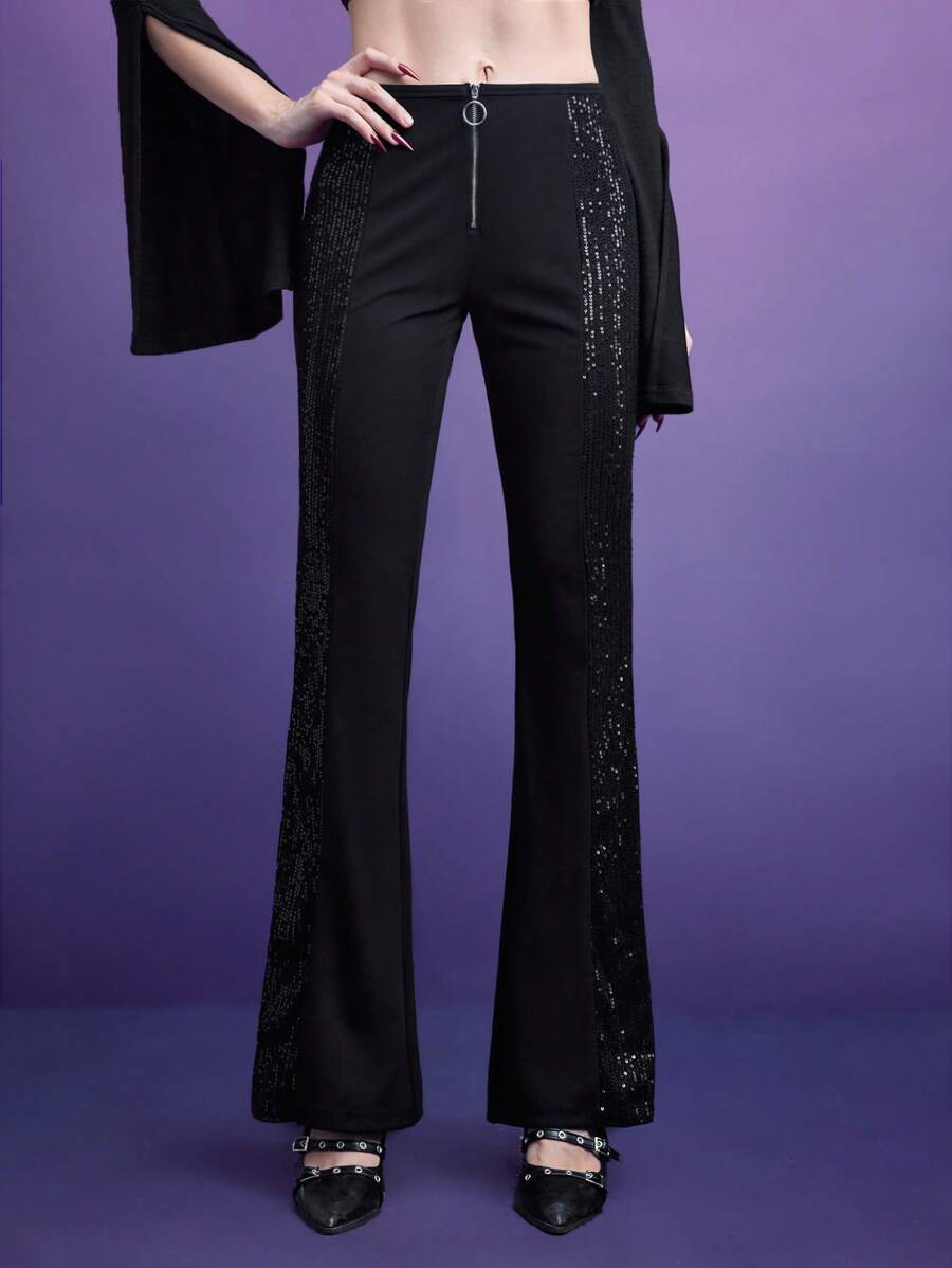 Contrast Sequin O-ring Zipper Fly Flare Leg Pants