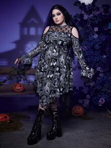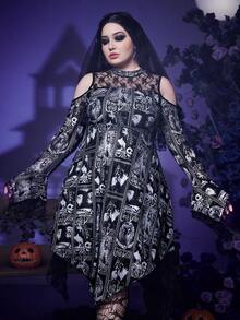Corpse Bride | ROMWE Plus Halloween Print Cold Shoulder Flounce Sleeve Hanky Hem Dress