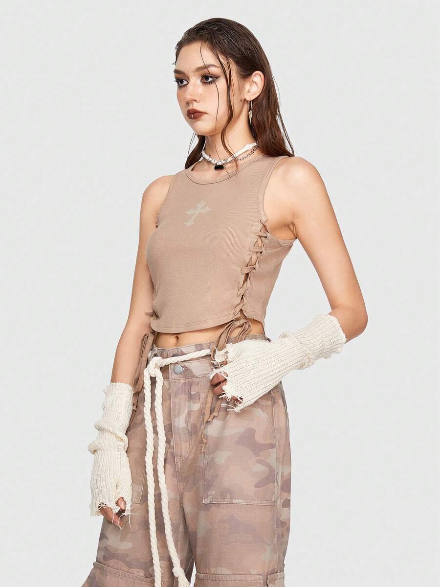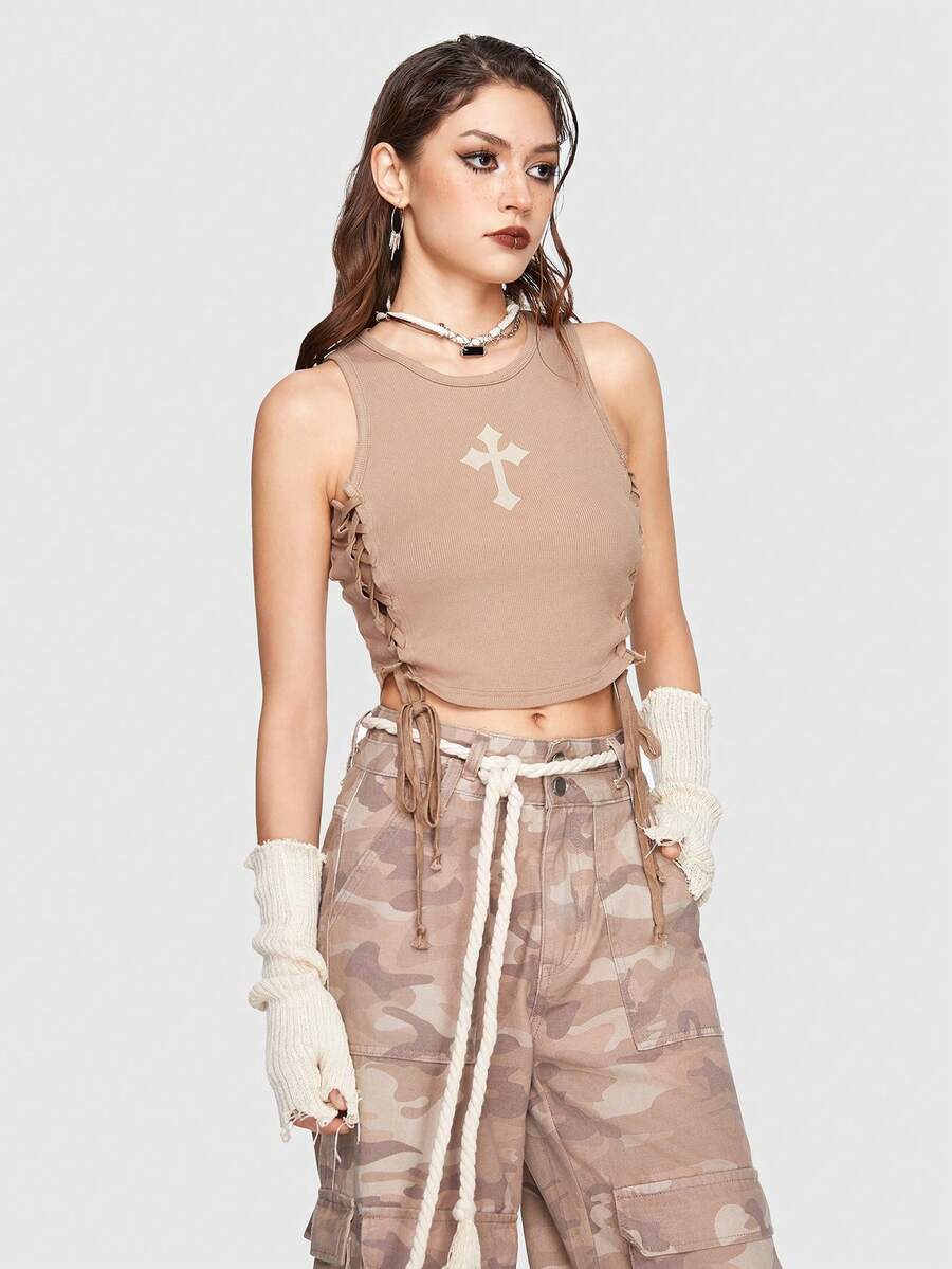 Cross Print Lace Up Side Tank Top
