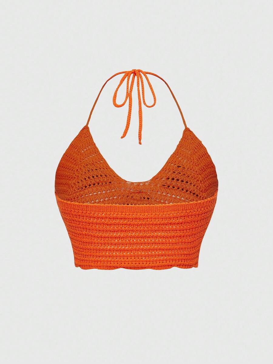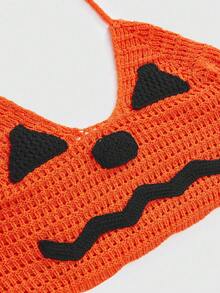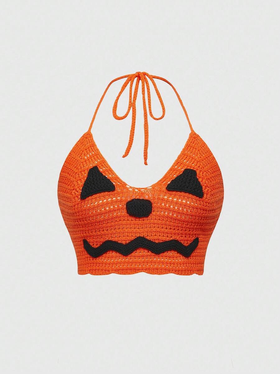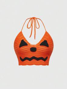Dark Halloween Pumpkin Knit Halter Neck Tie Back Tank Top For Women