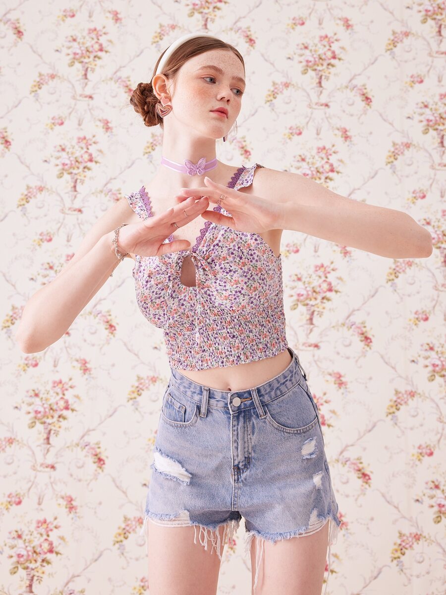 Ditsy Floral Contrast Lace Shirred Crop Top