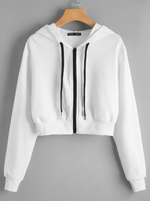 Drop Shoulder Zip Up Drawstring Crop Hoodie