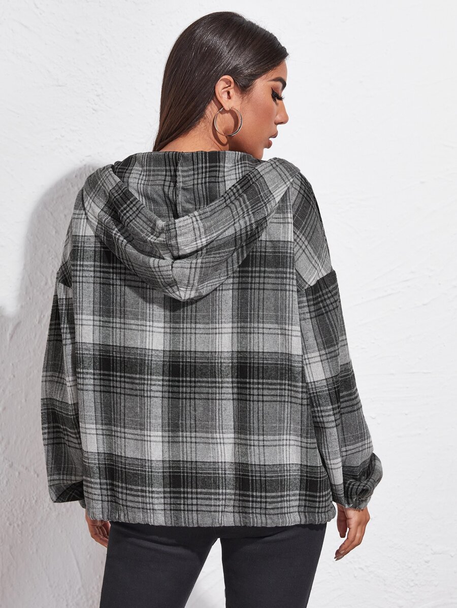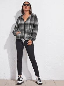 Drop Shoulder Zip Up Drawstring Tartan Hoodie