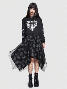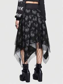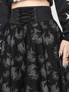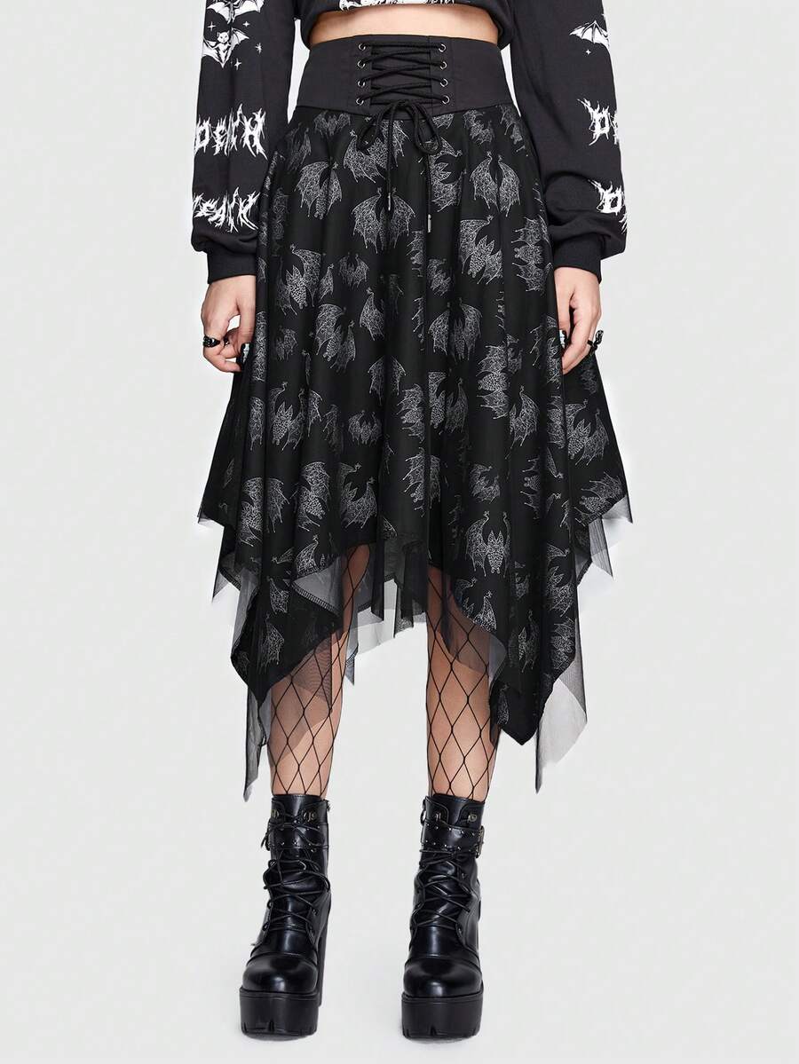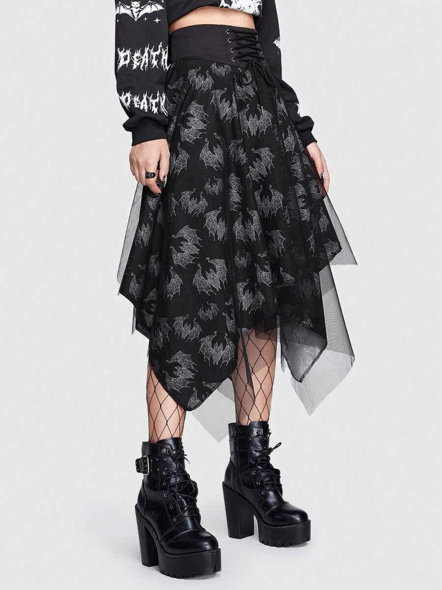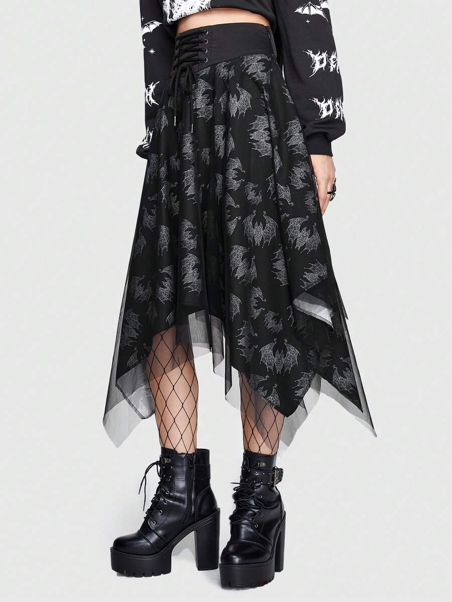 Emi Bee Skull Print Lace Up Front Hanky Hem Skirt