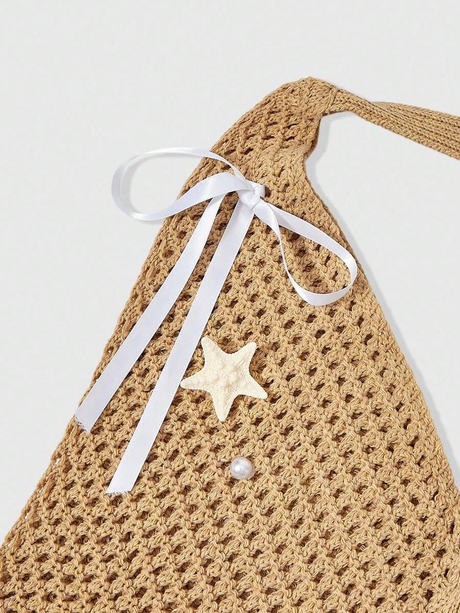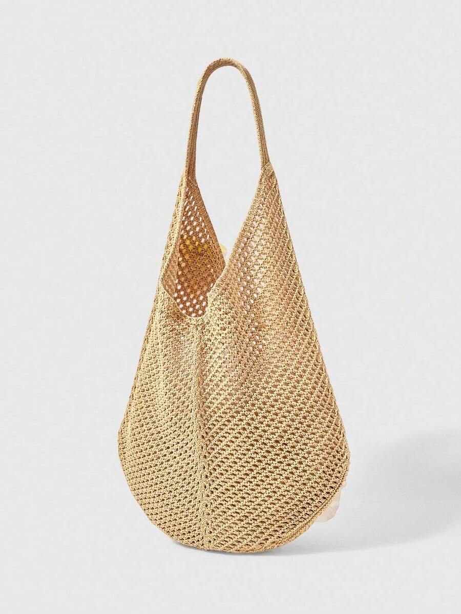 Fairycore 1 Set Beige Woven Beach Tote Bag & Accessories, Fashionable Personalized Floral Decor Beach Vacation Style Women Tote Bag (Includes 1 Bag And 1 Set Of Accessories)