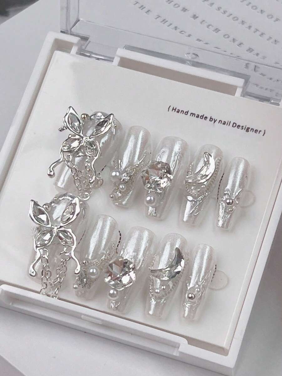 Fairycore 10pcs Long Butterfly & Rhinestone Decor False Nails With Free Jelly Glue Included
