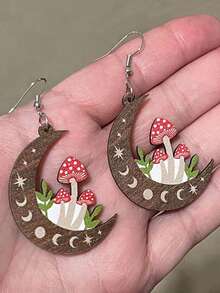 Fairycore 1pair Cute Wood Mushroom & Moon Drop Earrings For Women For Daily Decoration