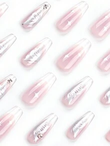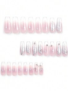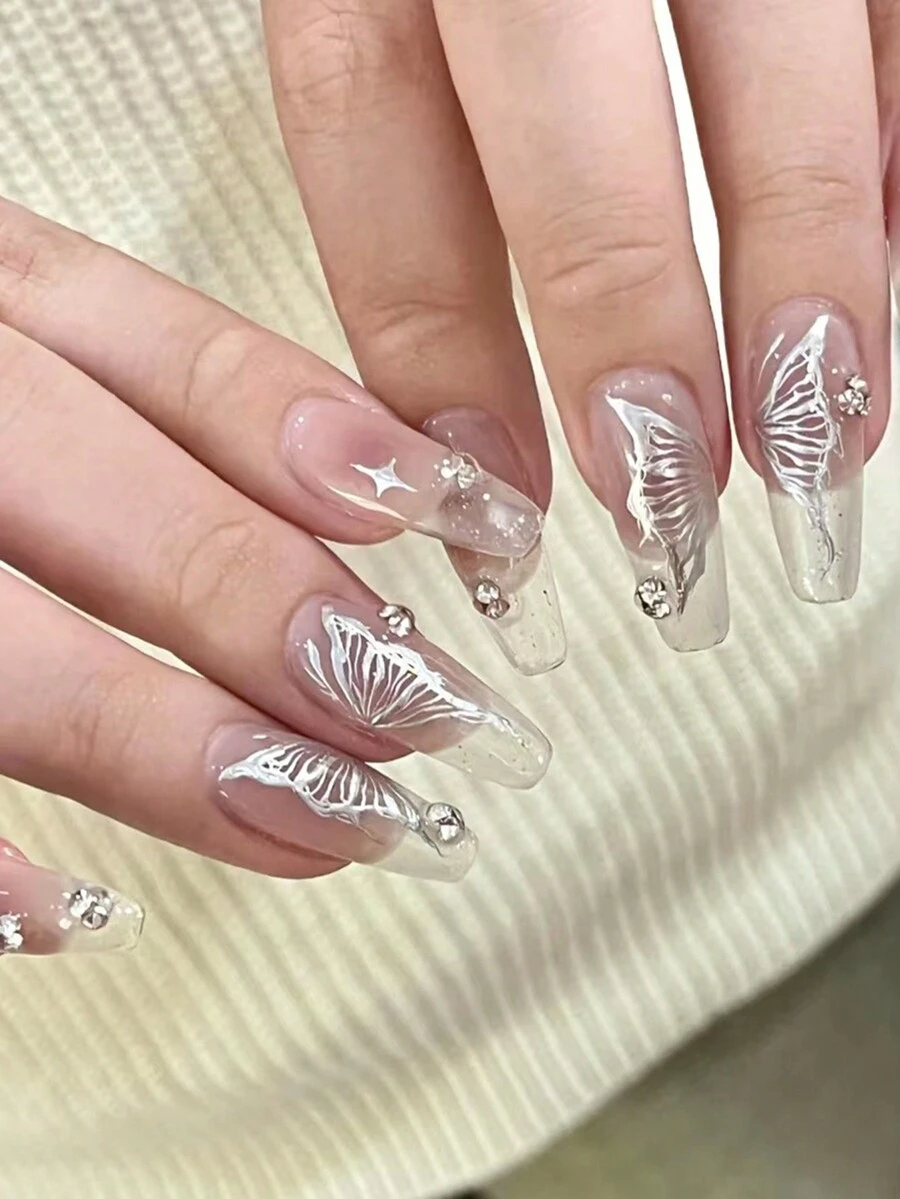 Fairycore 1set/box 24pcs Silver Butterfly Rhinestone Decorated False Nails