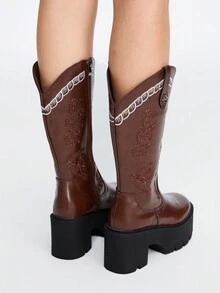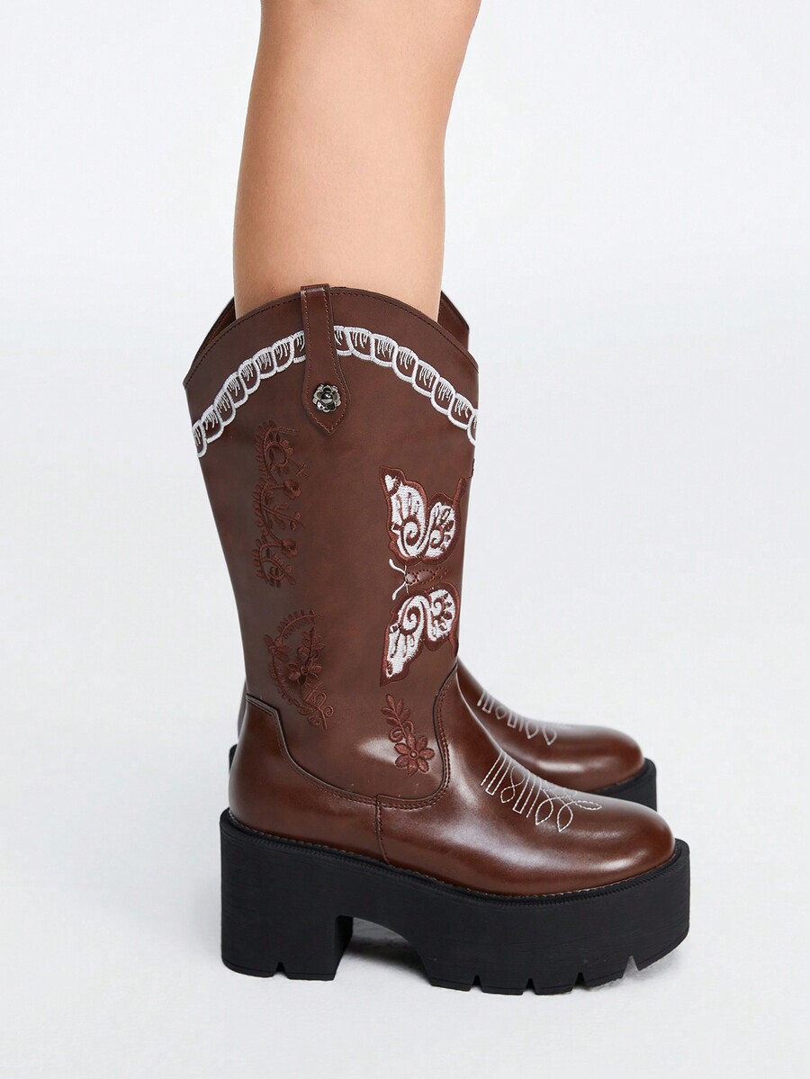 Fairycore 2023 New Arrivals Western Cowboy Knee-high Boots With Embroidered Design, Round Toe, For Short Women