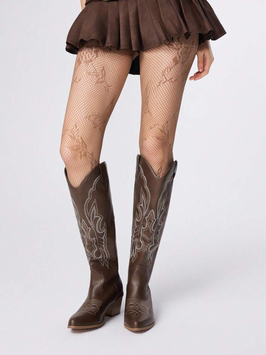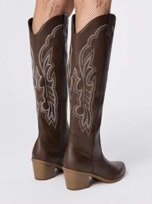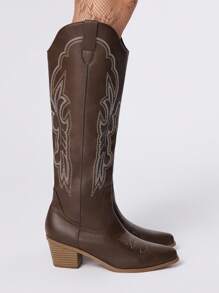 Fairycore Brown Western Style Embroidered Slip-On Knee High Boots, Women Fashion Leather Shoes For Spring Autumn