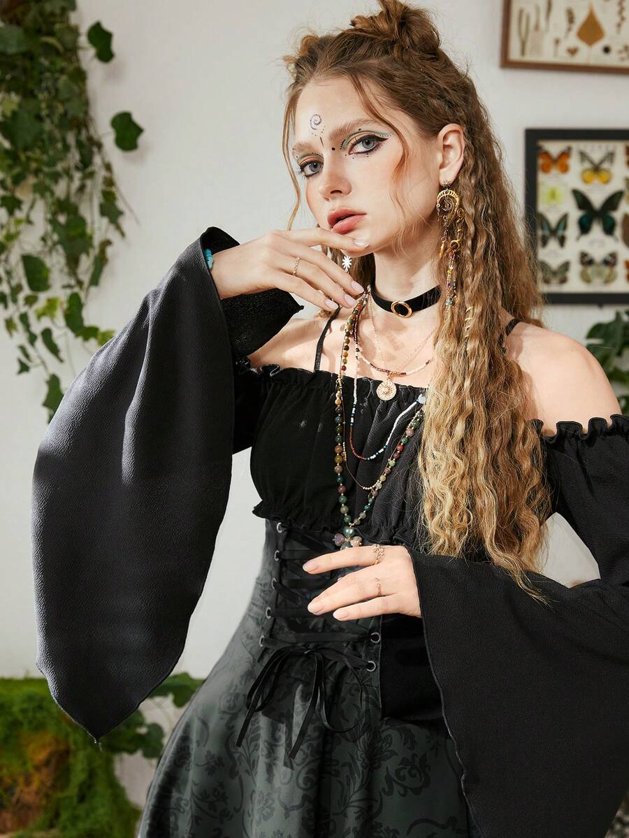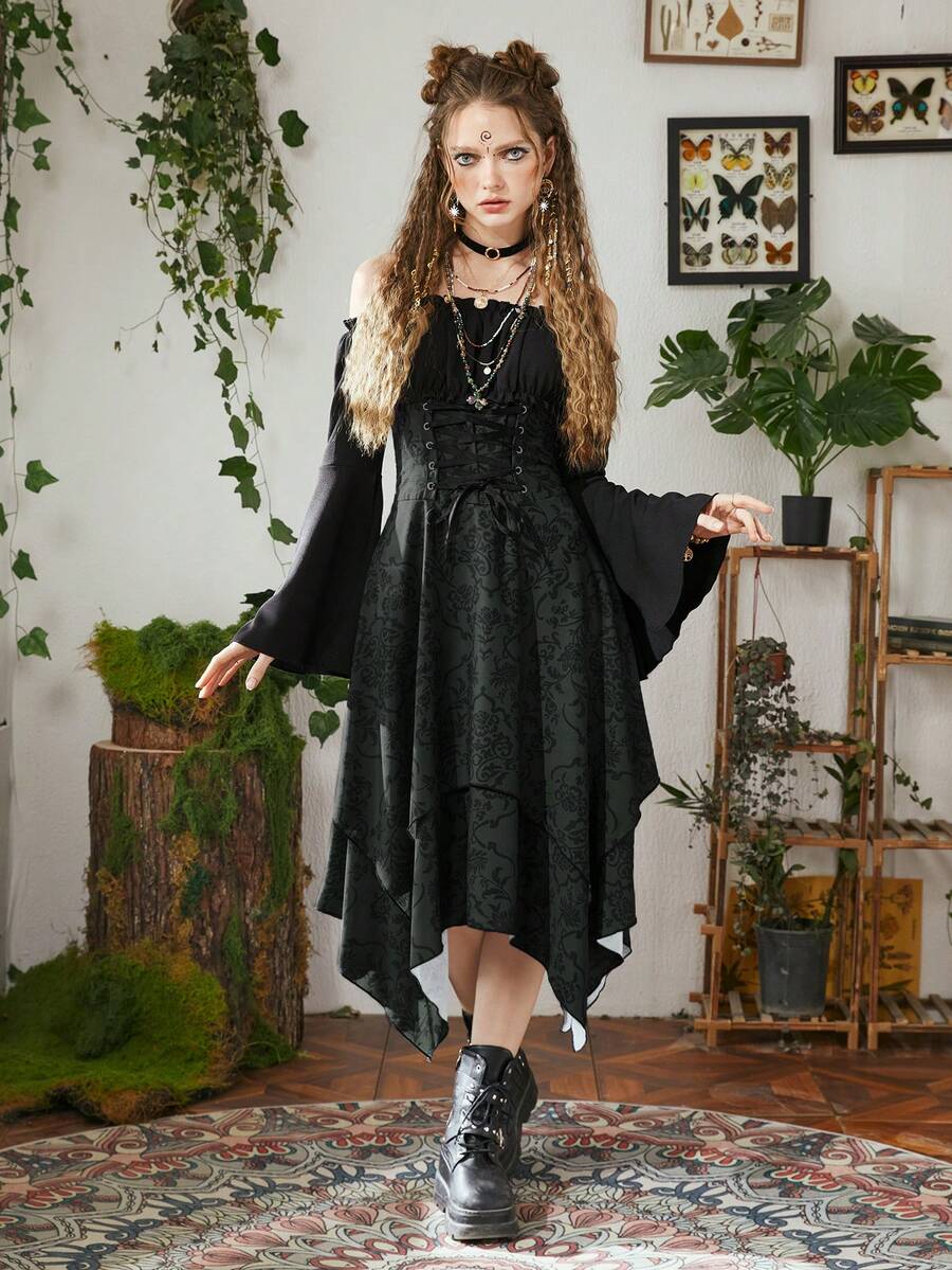 Fairycore Floral Print Lace Up Front Bell Sleeve Hanky Hem Dress