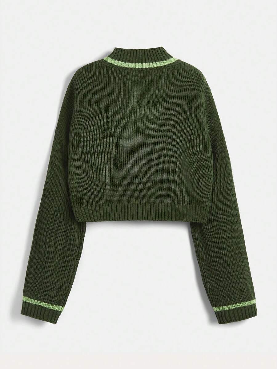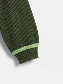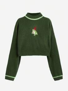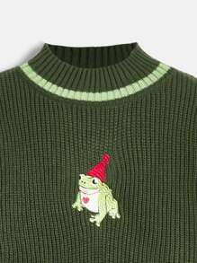 Fairycore Frog Embroidery Contrast Trim Drop Shoulder Sweater