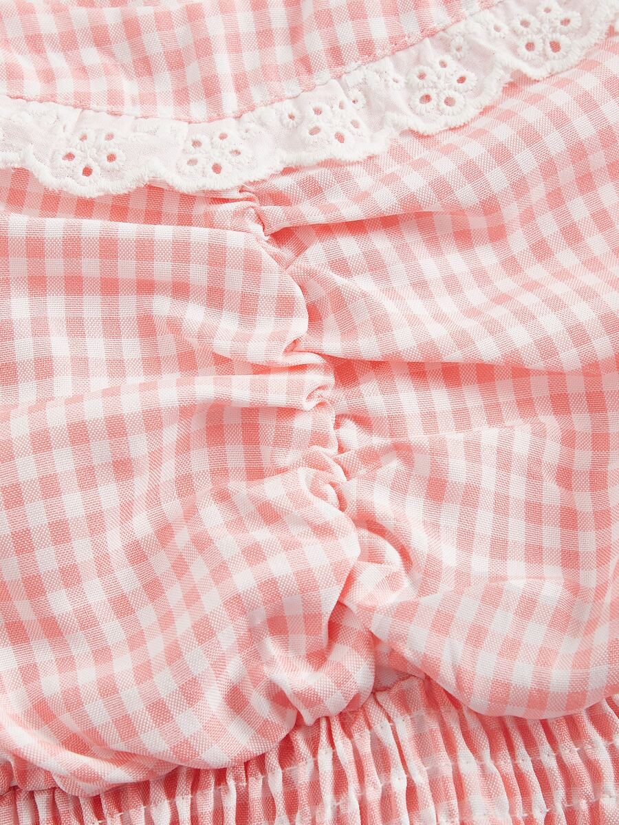 Gingham Ruched Bust Ruffle Hem Shirred Blouse