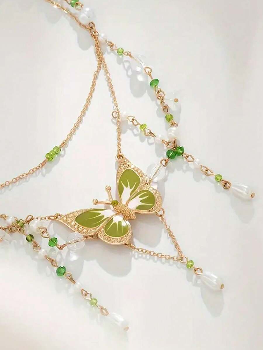 Fairycore Green Butterfly Necklace, Green Fairy Collar Necklace With Simulated Faux Pearl Butterfly Detail, Girl's Green Necklace