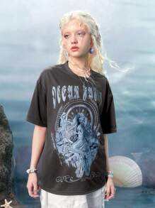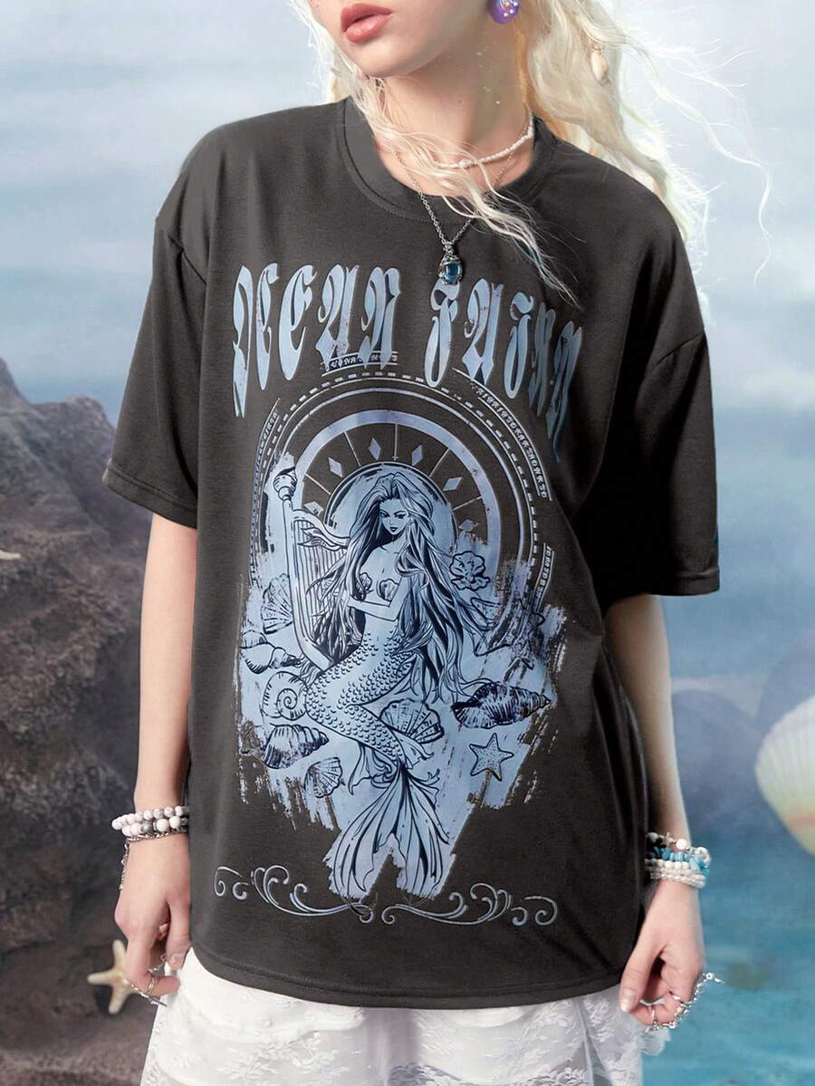 Fairycore Mermaid Letter Graphic Drop Shoulder Tee