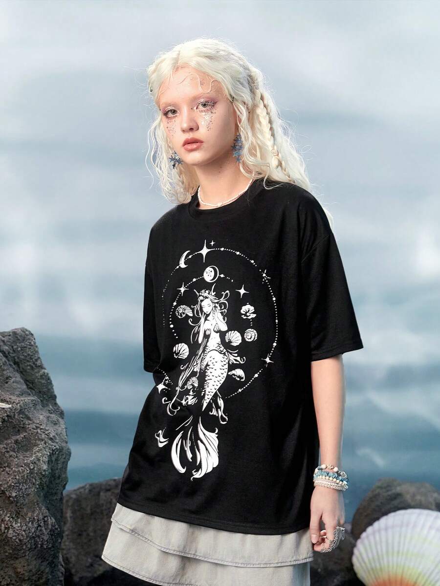 Fairycore Mermaid Moon & Figure Graphic Drop Shoulder Tee