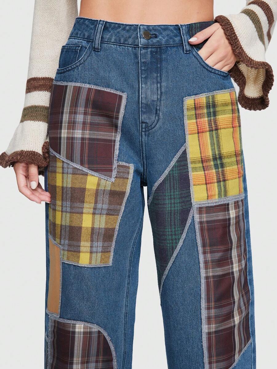 Fairycore Plaid Patched Straight Leg Jeans Without Belt