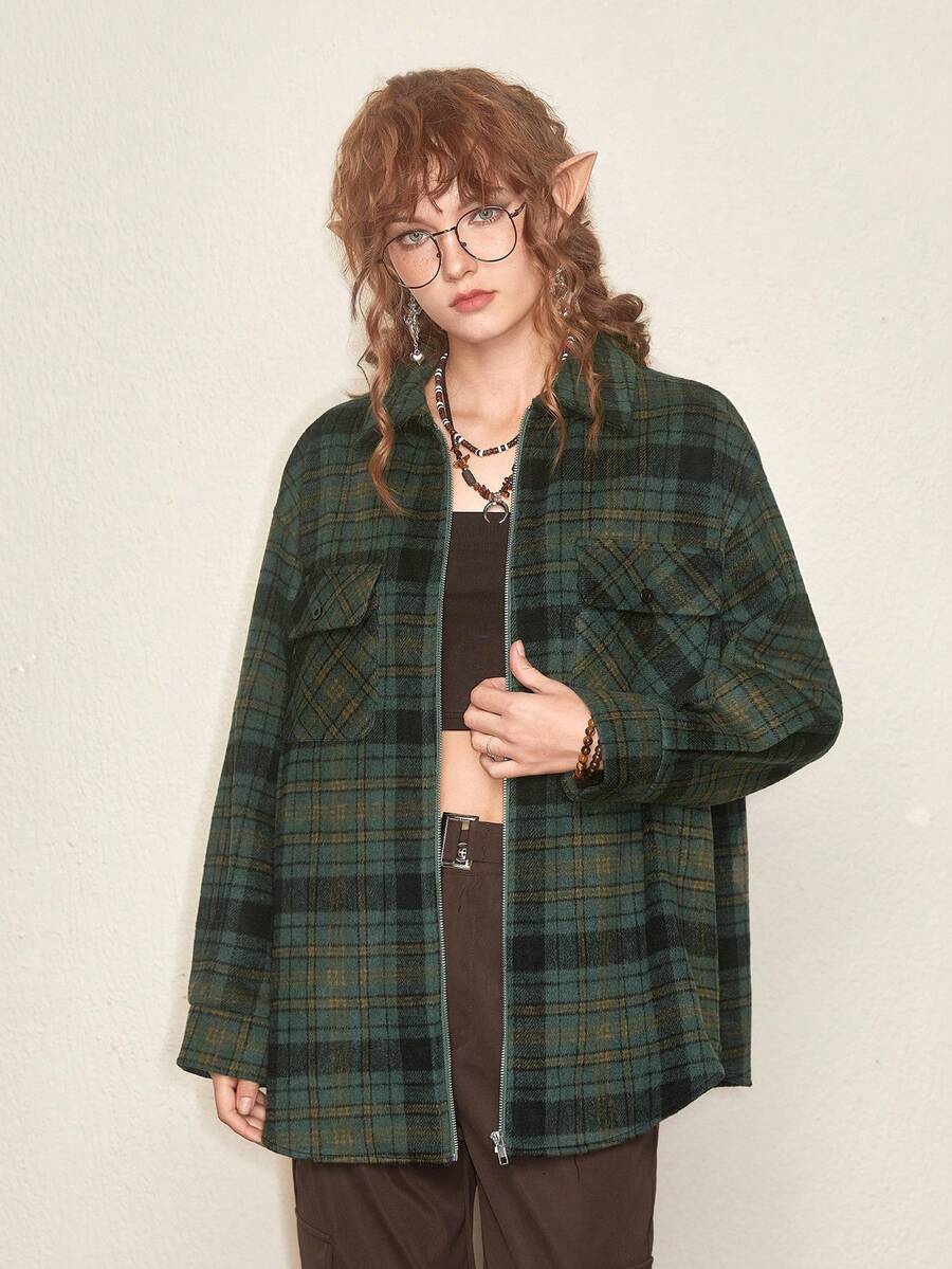 Fairycore Plaid Print Drop Shoulder Zip Up Flap Pocket Coat