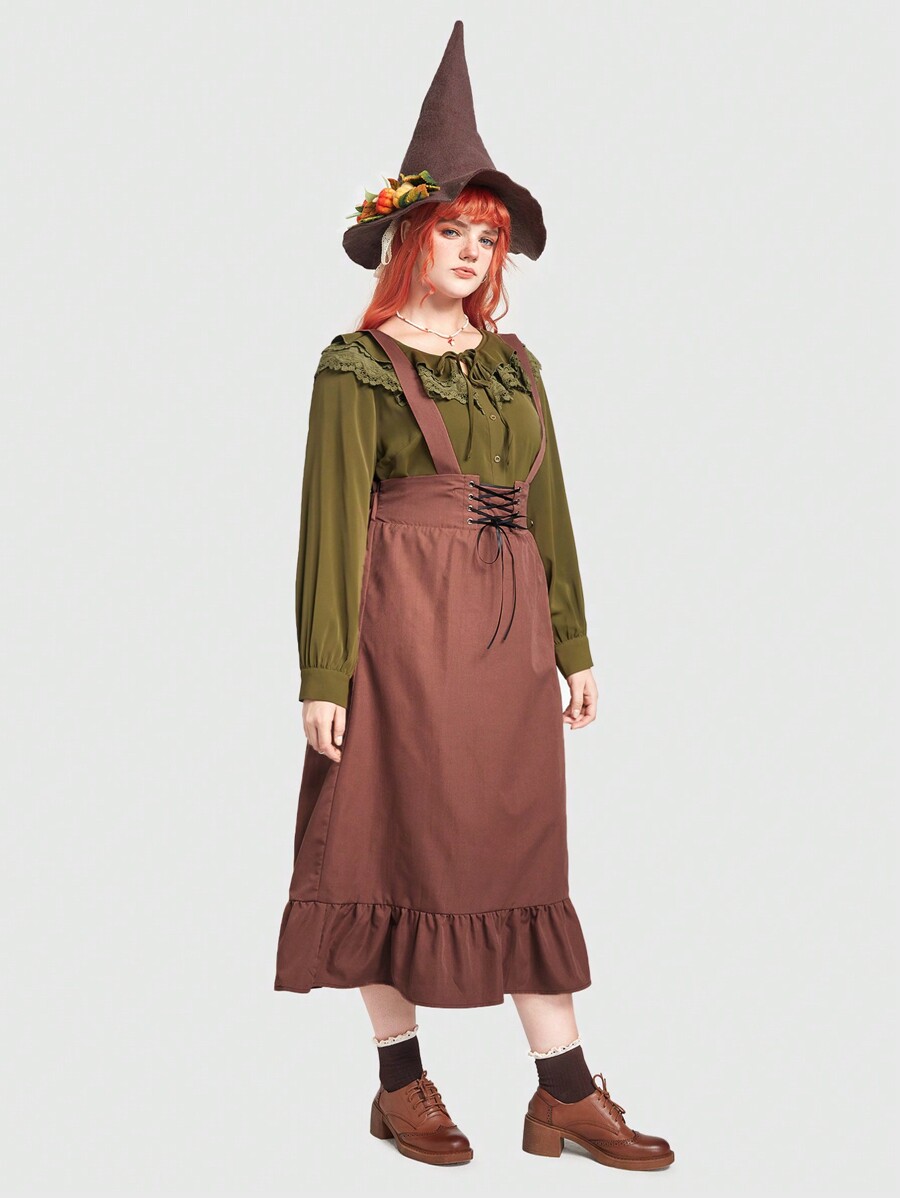Fairycore Plus Lace Up Front Ruffle Hem Overall Skirt Without Blouse