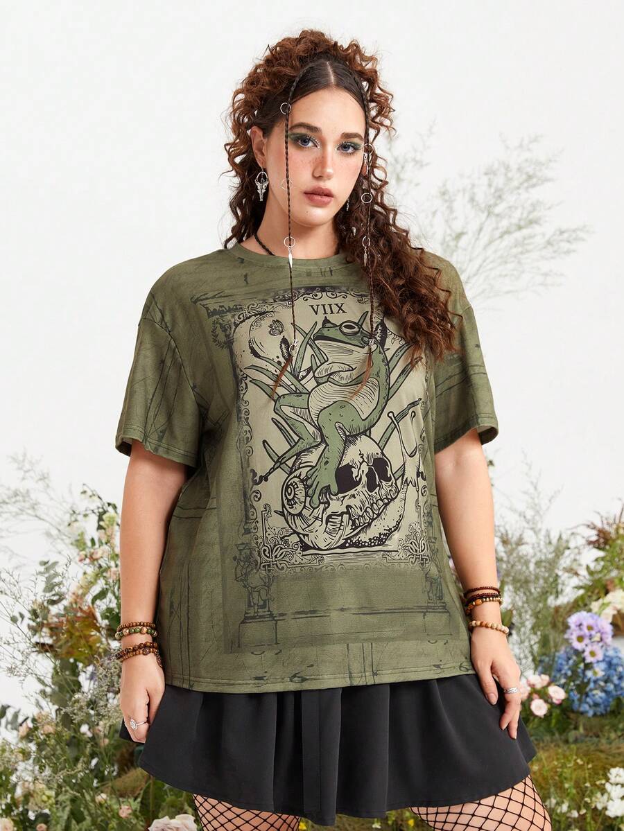 Fairycore Plus Skull & Frog Slogan Graphic Drop Shoulder Tee