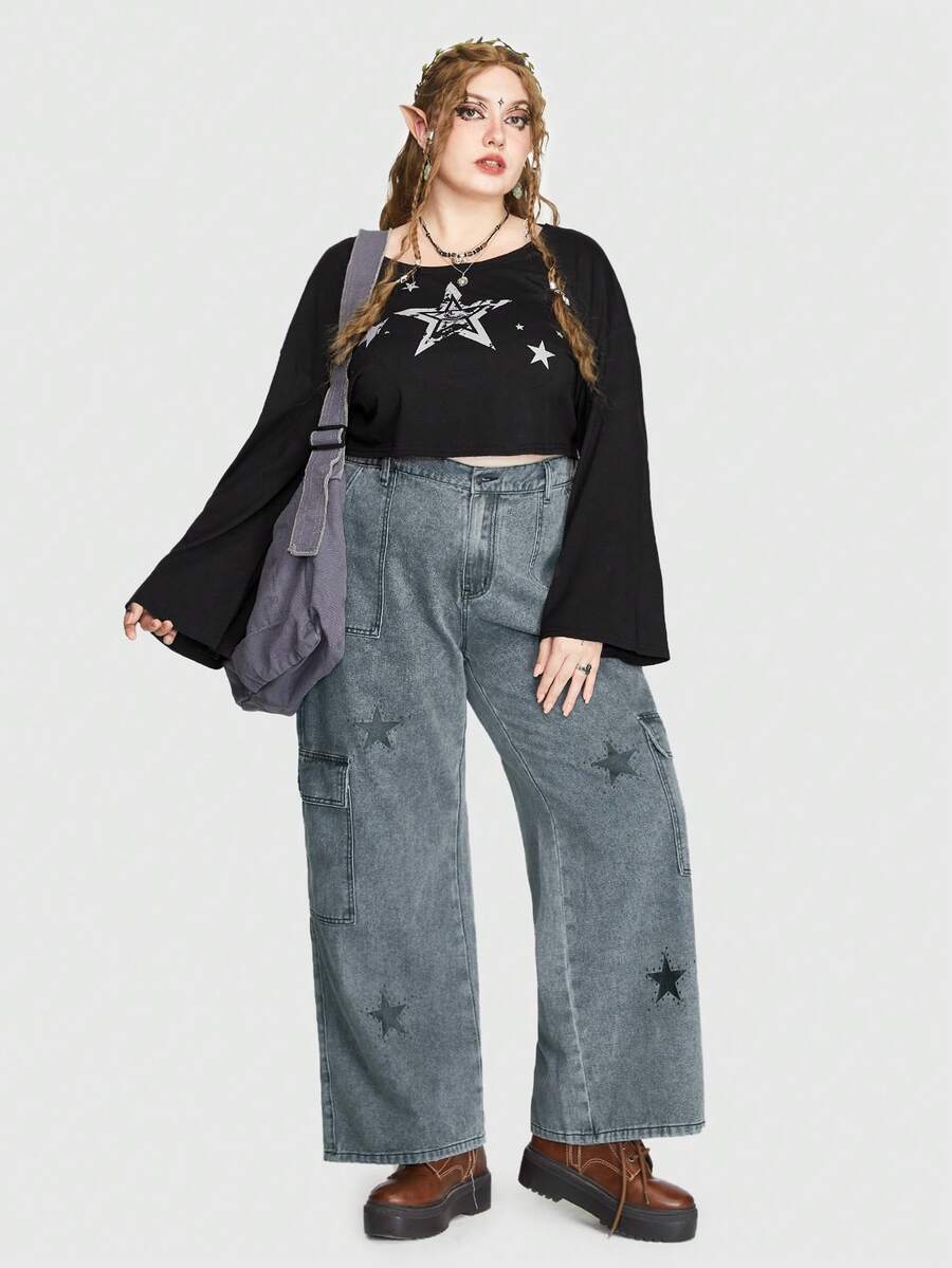 Fairycore Plus Star Print Trumpet Sleeve Tee